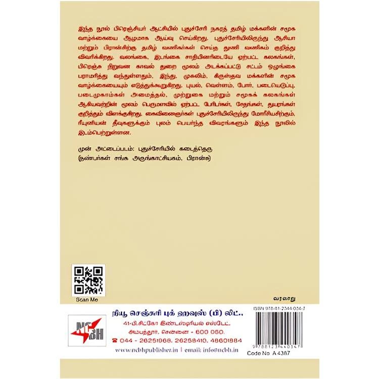Details : ISBN : 9788123440347 Author : S. Jeyaseela stephen Weight : 100.00gm Binding : Paper Back Language : Tamil Publishing Year : 2021 Pages : 165 Code no : A4387 பிரெஞ்சியர் ஆட்சியில் புதுச்சேரி மக்களின் சமூக வாழ்க்கை : இந்த நூல் பிரெஞ்சியர் ஆட்சியில் புதுச்சேரி நகரத் தமிழ் மக்களின் சமூக வாழ்க்கையை ஆழமாக ஆய்வு செய்கிறது. புதுச்சேரியிலிருந்து ஆசியா மற்றும் பிரான்சிற்கு தமிழ் வணிகர்கள் செய்த துணி வணிகம் குறித்து விவரிக்கிறது. வலங்கை, இடங்கை சாதியினரிடையே ஏற்பட்ட கலகங்கள், பிரெஞ்சு நிறுவன காவல் துறை மூலம் அடக்கப்பட்டு சட்டம் ஒழுங்கை பராமரித்து வந்துள்ளதும், இந்து, முசுலிம், கிருஸ்தவ மக்களின் சமூக வாழ்க்கையையும் எடுத்துக்கூறுகிறது. புயல், வெள்ளம், போர், படையெடுப்பு, படைமுகாம்கள் அமைத்தல், முற்றுகை மற்றும் சமூகக் கலகங்கள் ஆகியவற்றின் மூலம் பெருமளவில் ஏற்பட்ட பேரிடர்கள், சேதங்கள், துயரங்கள் குறித்தும் விளக்குகிறது. கைவினைஞர்கள் புதுச்சேரியிலிருந்து மோரீசியசிற்கும். ரீயுனியன் தீவுகளுக்கும் புலம் பெயர்ந்த விவரங்களும் இந்த நூலில் இடம்பெற்றுள்ளன. முன் அட்டைப்படம்: புதுச்சேரியில் கடைத்தெரு (நண்பர்கள் சங்க அருங்காட்சியகம், பிரான்சு) |