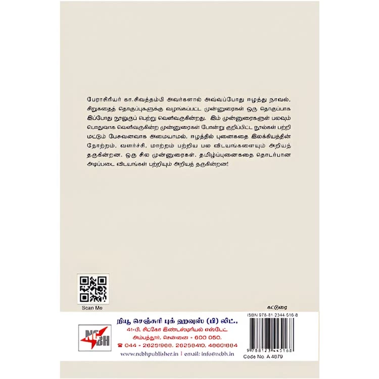 Details : Book Title : ஈழத்தில் புனைகதை இலக்கியம் தோற்றம் வளர்ச்சி மாற்றம் (eezhathil punaikathai ilakkiyam) Category : Articles ISBN : 9788123445168 Author : Prof. K. Sivathambi Weight : 100.00 gm Binding : Paper Back Language : Tamil Publishing Year : 2023 Code no : A4879 ஈழத்தில் புனைகதை இலக்கியம் தோற்றம் வளர்ச்சி மாற்றம் : பேராசிரியர் கா.சிவத்தம்பி அவர்களால் அவ்வப்போது ஈழத்து நாவல். சிறுகதைத் தொகுப்புகளுக்கு வழங்கப்பட்ட முன்னுரைகள் ஒரு தொகுப்பாக இப்போது நூலுருப் பெற்று வெளிவருகின்றது. இம் முன்னுரைகளுள் பலவும் பொதுவாக வெளிவருகின்ற முன்னுரைகள் போன்று குறிப்பிட்ட நூல்கள் பற்றி மட்டும் பேசுவனவாக அமையாமல், ஈழத்தில் புனைகதை இலக்கியத்தின் தோற்றம், வளர்ச்சி, மாற்றம் பற்றிய பல விடயங்களையும் அறியத் தருகின்றன. ஒரு சில முன்னுரைகள். தமிழ்ப்புனைகதை தொடர்பான அடிப்படை விடயங்கள் பற்றியும் அறியத் தருகின்றன! |