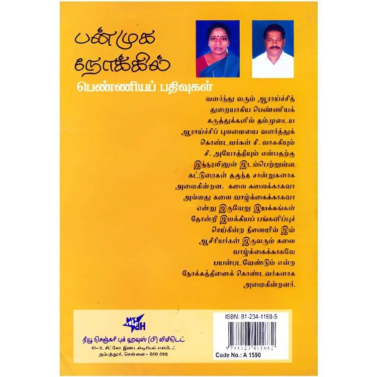 Details : Category : Essay Author : Dr.C. Vasuki ISBN : 9788123411682 Weight : 100.00 gm Binding : Paper Back Language : Tamil Publishing Year : 2007 Pages : 192 Code no : A1590 பன்முக நோக்கில் பெண்ணியப் பதிவுகள் : பன்முக நோக்கில் பெண்ணியப் பதிவுகள் வளர்ந்து வரும் ஆராய்ச்சித் துறையாகிய பெண்ணியக் கருத்துக்களில் தம்முடைய ஆராய்ச்சிப் புலமையை வளர்த்துக் கொண்டவர்கள் சி. வாசுகியும் சி. அயோத்தியும் என்பதற்கு இந்நூலினுள் இடம்பெற்றுள்ள கட்டுரைகள் தகுந்த சான்றுகளாக அமைகின்றன. கலை கலைக்காகவா அல்லது கலை வாழ்க்கைக்காகவா என்று இருவேறு இயக்கங்கள் தோன்றி இலக்கியப் பங்களிப்புச் செய்கின்ற நிலையில் இவ் ஆசிரியர்கள் இருவரும் கலை வாழ்க்கைக்காகவே பயன்படவேண்டும் என்ற நோக்கத்தினைக் கொண்டவர்களாக அமைகின்றனர். |