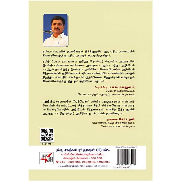 Details : Edition : 5 Category : Politics Author : T. Stalin Gunasekaran ISBN : 978123446028 Binding : Paper Back Weight : 100.00gm Publishing Year : 2024 Language : Tamil Pages : 80 Code no : A4982 ம.சிங்காரவேலரின் அறிவியல் சிந்தனைகள் : நண்பர் ஸ்டாலின் குணசேகரன் இச்சிறுநூலில் ஒரு புதிய பார்வையில் சிங்காரவேலருக்கு உரிய புகழைக் கூட்டியிருக்கிறார். தமிழ் பேசும் நல் உலகம் தமிழ்த் தொண்டர் ஸ்டாலின் அவர்களின் இரண்டு கண்களாகக் காண்பவை அவருடைய நூல் – பற்றும் அறிவியல் – பற்றும் தான் இந்த இரண்டின் ஒளிவீச்சும் சிங்காரவேலரின் அறிவியல் சிந்தனைகளின் குறிக்கோளைச் சரியான பார்வையில் வாசகர்களின் மனதில் நிறுத்தும் என்பதில் எனக்குப் பெருநம்பிக்கை. சிறுநூல்தான் என்றாலும் சிங்காரவேலருக்கு இது ஓர் அறிவியல் மகுடம்! பேராசிரியர் ப.க.பொன்னுசாமி மேனாள் துணைவேந்தர், சென்னை மற்றும் மதுரைப் பல்கலைக்கழகங்கள் ‘அறிவியலாளர்களே பெரியோர்’ என்கிற அழுத்தமான எண்ணம் கொண்டு செயல்பட்டவர் சிந்தனைச் சிற்பி சிங்காரவேலர் என்பதை ‘ம.சிங்காரவேலரின் அறிவியல் சிந்தனைகள்’ என்கிற இந்த நூலில் அழுத்தமாக நிறுவுகிறார் ஆசிரியர் த.ஸ்டாலின் குணசேகரன். முனைவர் கோ.பழனி பேராசிரியர், தமிழ் இலக்கியத்துறை, சென்னைப் பல்கலைக்கழகம் |