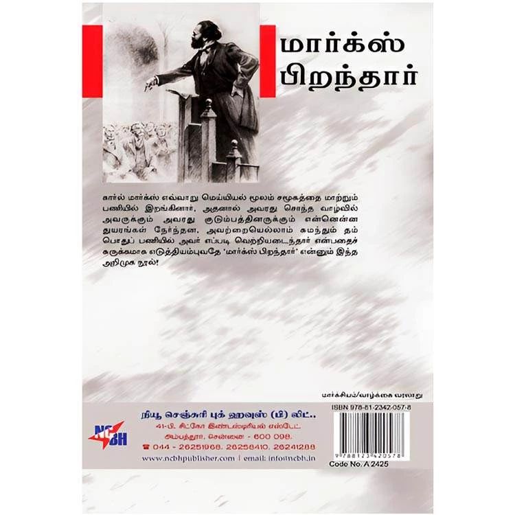 Details : Category : Marxism , History ISBN : 9788123420578 Author : Hendri Volkav Translator : N. Dharmarajan Weight : 100.00 gm Binding : Paper Back Language : Tamil Publishing Year : 2017 Code no : A2425 Pages : 240 மார்க்ஸ் பிறந்தார் : கார்ல் மார்க்ஸ் எவ்வாறு மெய்யியல் மூலம் சமூகத்தை மாற்றும் பணியில் இறங்கினார், அதனால் அவரது சொந்த வாழ்வில் அவருக்கும் அவரது குடும்பத்தினருக்கும் என்னென்ன துயரங்கள் நேர்ந்தன, அவற்றையெல்லாம் சுமந்தும் தம் பொதுப் பணியில் அவர் எப்படி வெற்றியடைந்தார் என்பதைச் சுருக்கமாக எடுத்தியம்புவதே ‘மார்க்ஸ் பிறந்தார்” என்னும் இந்த அறிமுக நூல்! |