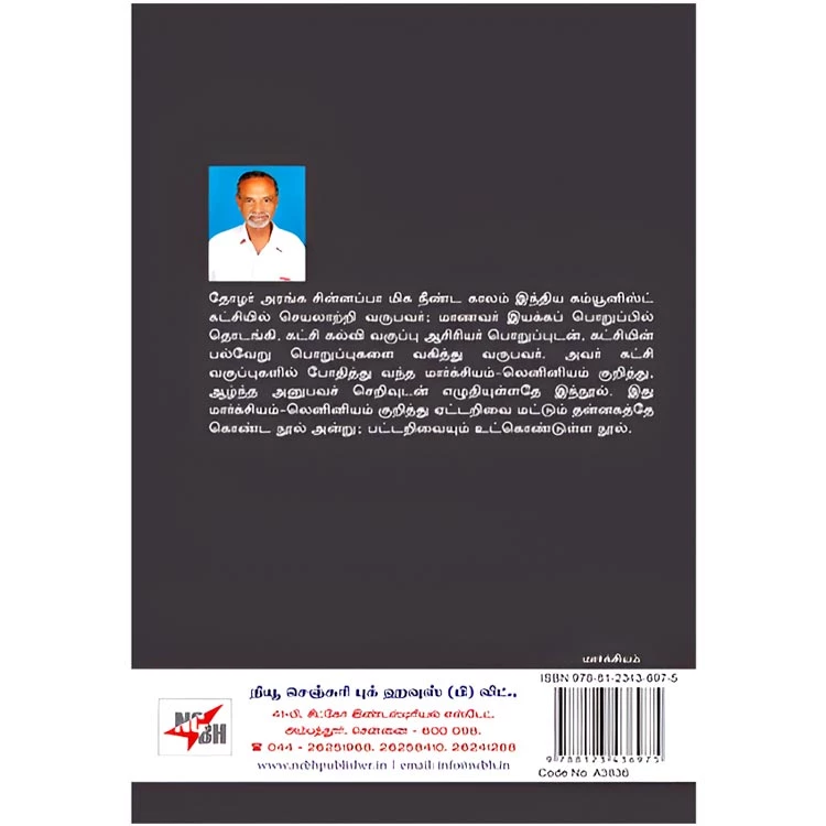 Details : Category : Marxism ISBN : 9788123436975 Author : Aranga Chinnappa Weight : 100.00gm Binding : Paper Back Language : Tamil Publishing Year : 2018 Code no : A3836 மார்க்சிய-லெனினியம் தத்துவச் செயலாக்கம் : தோழர் அரங்க சின்னப்பா மிக நீண்ட காலம் இந்திய கம்யூனிஸ்ட் கட்சியில் செயலாற்றி வருபவர்; மாணவர் இயக்கப் பொறுப்பில் தொடங்கி, கட்சி கல்வி வகுப்பு ஆசிரியர் பொறுப்புடன், கட்சியின் பல்வேறு பொறுப்புகளை வகித்து வருபவர். அவர் கட்சி வகுப்புகளில் போதித்து வந்த மார்க்சியம்-லெனினியம் குறித்து. ஆழ்ந்த அனுபவச் செறிவுடன் எழுதியுள்ளதே இந்நூல். இது மார்க்சியம்-லெனினியம் குறித்து ஏட்டறிவை மட்டும் தன்னகத்தே கொண்ட நூல் அன்று; பட்டறிவையும் உட்கொண்டுள்ள நூல். |