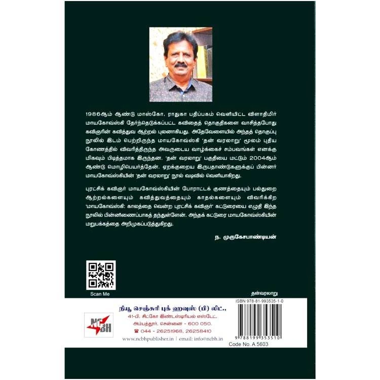 Details : Book Name : Ennai Patri Naan Regional Name : என்னைப் பற்றி நான் Author : ந.முருகேசபாண்டியன் Edition : 1st Edition ISBN : 9788199353510 Category : Bio Graphy Binding : Paper Binding Language : Tamil Publishing Year : 2025 Pages : 80 Code No : A5603 என்னைப் பற்றி நான் : 1986ஆம் ஆண்டு மாஸ்கோ, ராதுகா பதிப்பகம் வெளியிட்ட விளாதிமிர் மாயகோவ்ஸ்கி தேர்ந்தெடுக்கப்பட்ட கவிதைத் தொகுதிகளை வாசித்தபோது கவிஞரின் கவித்துவ ஆற்றல் புலனாகியது. அதேவேளையில் அந்தத் தொகுப்பு நூலில் இடம் பெற்றிருந்த மாயகோவ்ஸ்கி ‘தன் வரலாறு’ மூலம் புதிய கோணத்தில் விவரித்திருந்த அவருடைய வாழ்க்கைச் சம்பவங்கள் எனக்கு மிகவும் பிடித்தமாக இருந்தன. ‘தன் வரலாறு’ பகுதியை மட்டும் 2004ஆம் ஆண்டு மொழிபெயர்த்தேன். ஏறக்குறைய இருபதாண்டுகளுக்குப் பின்னர் மாயகோவ்ஸ்கியின் ‘தன் வரலாறு’ நூல் வடிவில் வெளியாகிறது. புரட்சிக் கவிஞர் மாயகோவ்ஸ்கியின் போராட்டக் குணத்தையும் பல்துறை ஆற்றல்களையும் கவித்துவத்தையும் காதல்களையும் விவரிக்கிற ‘மாயகோவ்ஸ்கி: காலத்தை வென்ற புரட்சிக் கவிஞர்’ கட்டுரையை எழுதி இந்த நூலில் பின்னிணைப்பாகத் தந்துள்ளேன். அந்தக் கட்டுரை மாயகோவ்ஸ்கியின் மறுபக்கத்தை அறிமுகப்படுத்துகிறது. ந. முருகேசபாண்டியன் |