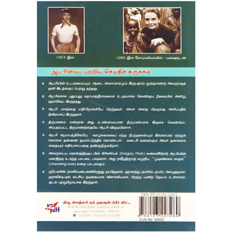 Details : Category : History ISBN : 9788123423289 Author : Actor Rajesh Weight : 100.00 gm Binding : Paper Back Language : Tamil Publishing Year : 2013 Pages : 128 Code no : A2692 கருணை உள்ளம் கொண்ட நடிகை ஆட்ரி ஹெப்பர்ன் : * ஆட்ரியின் உடலமைப்பும். ஆடை அலங்காரமும் இருபதாம் நூற்றாண்டு அவருக்குத் தனி இடத்தைப் பெற்று தந்தது. * ஆட்ரிக்காக புதுப்புது கதாபாத்திரங்களை உருவாக்க வேண்டிய நிலையில் அன்று ஹாலிவுட் இருந்தது. * ஆட்ரி பாசத்தை எதிர்நோக்கியே பிறந்தவர். அவர் அதை பிறருக்கு அளிப்பதில் தீவிரமாய் இருந்தார். * திருமணம் என்றால் அது உண்மையான திருமணமாக இருக்க வேண்டும். அப்படிப்பட்ட திருமணத்தையே ஆட்ரி விரும்பினார். * ஆட்ரி ஆரம்பத்திலேயே வாழ்க்கையை எந்த நிபந்தனையும் இல்லாமல் ஏற்றுக் கொள்ள தன்னை தயார்படுத்திக் கொண்டார். கடைசி வரைக்கும் அவர் தனக்காக எதையும் எதிர்பார்ப்பதை தவிர்த்திருக்கிறார். * அவருடைய மரணத்திற்குப் பின் கிரிகரிபெக் (Gregory Peck) கண்ணிரோடு ஆட்ரியின் மனதிற்கு உகந்த பாட்டை பாடினார். அது ரவீந்திரநாத் எழுதிய “முடிவில்லா காதல்’ (Unending love) என்ற பாடலாகும். *ஹிட்லரின் நாஸிப்படைகளிலிருந்து தப்பித்தவர். ஹாலந்து குளிரில் தப்பிப் பிழைத்தவர். ஹாலிவுட்டில் லட்சிய நடிகையாக விளங்கியவர். சிறந்த மனித நேயம் உள்ளவர். சூடல் புற்றுநோயால் இறந்தார். |