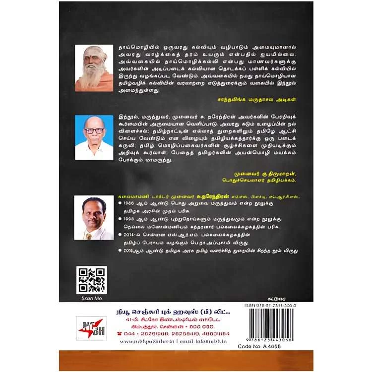 Details : ISBN : 9788123443058 Author : Dr. S. Narenthiran Weight : 100.00gm Binding : Paper Back Language : Tamil Publishing Year : 2015 Code no : A4658 தமிழ் பயிற்றுமொழி கனவும் நனவும் : தாய்மொழியில் ஒருவரது கல்வியும் வழிபாடும் அமையுமானால் அவரது வாழ்க்கைத் தரம் உயரும் என்பதில் ஐயமில்லை. அவ்வகையில் தாய்மொழிக்கல்வி என்பது மாணவர்களுக்கு அவர்களின் அடிப்படைக் கல்வியான தொடக்கப் பள்ளிக் கல்வியில் இருந்து வழங்கப்பட வேண்டும். அவ்வகையில் நமது தாய்மொழியான தமிழ்வழிக் கல்வியின் வரலாற்றை எடுத்துரைக்கும் வகையில் இந்நூல் அமைந்துள்ளது. சாந்தலிங்க மருதாசல அடிகள் : இந்நூல், மருத்துவர். முனைவர் சு. நரேந்திரன் அவர்களின் பேரறிவுக் கூர்மையின் அருமையான வெளிப்பாடு. அவரது கடும் உழைப்பின் நல் விளைச்சல்; தமிழ்நாட்டின் எல்லாத் துறைகளிலும் தமிழே ஆட்சி செய்ய வேண்டும் என விழையும் தமிழியக்கத்தார்க்கு ஒரு படைக் ககுவி, தமிழ் மொழிப்பகைவர்களின் சூழ்ச்சிகளை முறியடிக்கும் அறிவுக் கூர்வாள்; பேதைத் தமிழர்களின் அயன்மொழி மயக்கம் போக்கும் மாமருந்து. முனைவர் குதிருமாறன், பொதுச்செயலாளர் தமிழியக்கம், கலைமாமணி டாக்டர் முனைவர் சு.நரேந்திரன் எம்.எஸ் பி.எச்டி. எப்.ஆர்.சி.எம், 1988 ஆம் ஆண்டு பொது அறுவை மருத்துவம் என்ற நூலுக்கு தமிழக அரசின் முதன் பரிசு, • 1998 ஆம் ஆண்டு புற்றுநோய்களும் மருத்துவமும் என்ற நூலுக்கு நெல்லை மனோன்மணியம் சுந்தரனார் பல்கலைக்கழகத்தின் பரிசு • 2014-ல் சென்னை எஸ்.ஆர்.எம். பல்கலைக்கழகத்தின் தமிழ்ப் பேராயம் வழங்கும் பெ.நா.அப்புசாமி விருது. 8 2078ஆம் ஆண்டு தமிழக அரசு தமிழ் வளர்ச்சித் துறையின் சிறந்த நூல் விருது. |