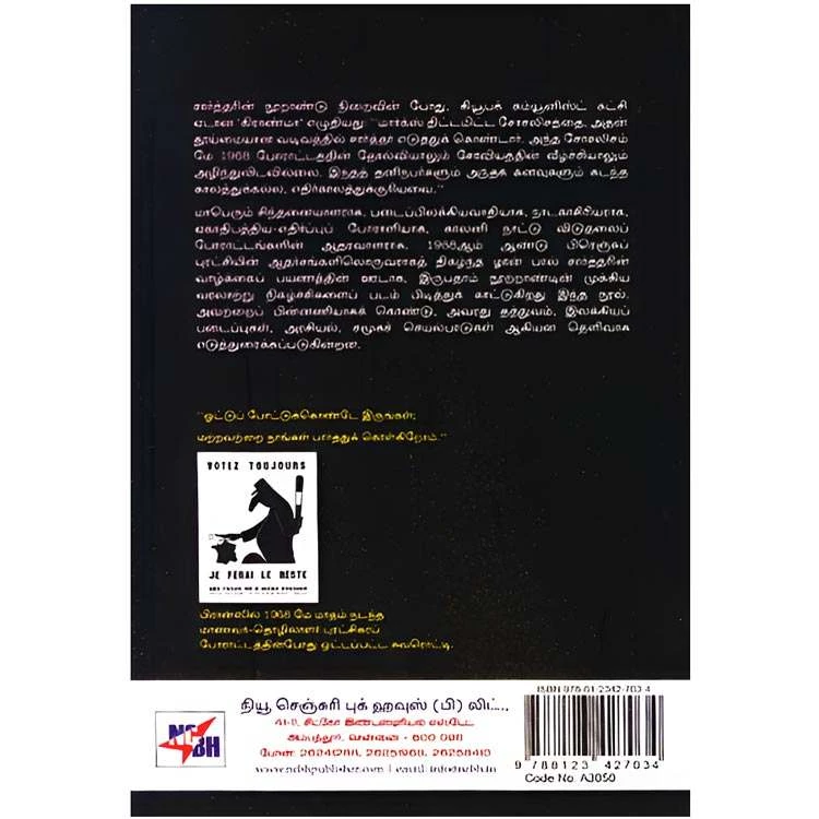 Details : ISBN : 9788123427034 Author : S. V. Rajadurai Weight : 100.00 gm Binding : Paper Back Language : Tamil Publishing Year : 2014 Code no : A3050 Page: 224 சார்த்தர் : சார்த்தரின் நூறாண்டு நிறைவின் போது, கியூபக் கம்யூனிஸ்ட் கட்சி ஏடான ‘கிராண்மா’ எழுதியது: “மார்க்ஸ் திட்டமிட்ட சோசலிசத்தை, அதன் தூய்மையான வடிவத்தில் சார்த்தர் எடுத்துக் கொண்டார். அந்த சோசலிசம் மே 1958 போராட்டத்தின் தோல்வியாலும் சோவியத்தின் வீழ்ச்சியாலும் அழிந்துவிடவில்லை. இந்தத் தனிநபர்களும் அந்தக் கனவுகளும் கடந்த காலத்துக்கல்ல, எதிர்காலத்துக்குரியவை.” மாபெரும் சிந்தளையாளராக. படைப்பிலக்கியவாதியாக, நாடகாசிரியராக. ஏகாதிபத்திய-எதிர்ப்புப் போராளியாக, காலனி நாட்டு விடுதலைப் போராட்டங்களின் ஆதரவாளராக, 1958ஆம் ஆண்டு பிரெஞ்சுப் புரட்சியின் ஆதர்சங்களிலொருவராகத் திகழ்ந்த ழான் பால் சார்த்தரின் வாழ்க்கைப் பயணத்தின் ஊடாக, இருபதாம் நூற்றாண்டின் முக்கிய வரலாற்று நிகழ்ச்சிகளைப் படம் பிடித்துக் காட்டுகிறது இந்த நூல், அவற்றைப் பின்னணியாகக் கொண்டு. அவரது தத்துவம், இலக்கியப் படைப்புகள், அரசியல், சமூகச் செயல்பாடுகள் ஆகியன தெளிவாக எடுத்துரைக்கப்படுகின்றன. |