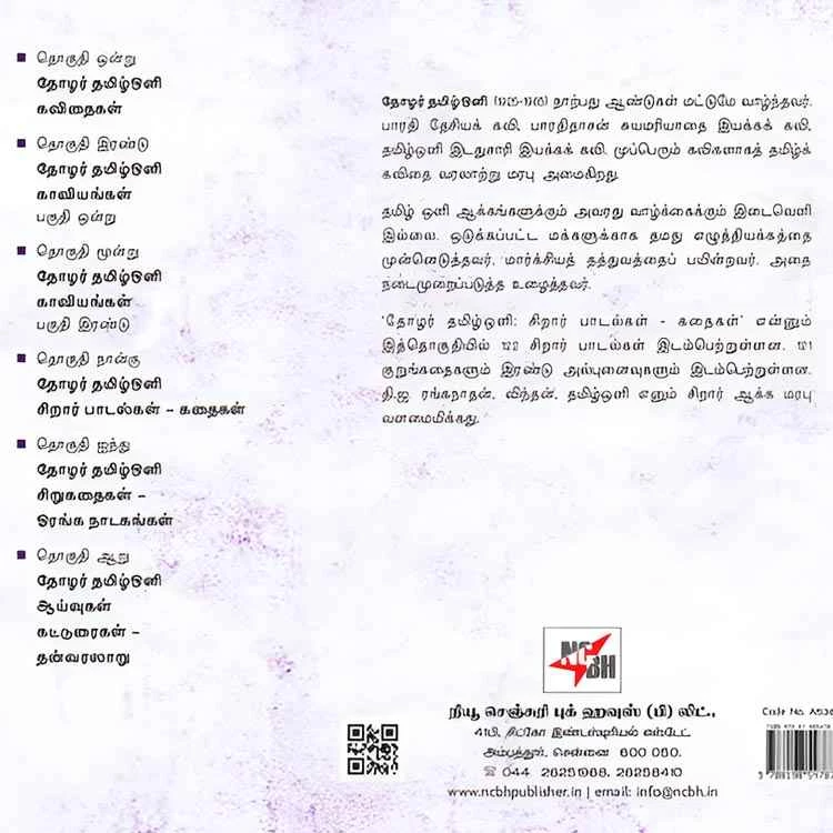 Details : Author: வீ.அரசு (பதிப்பாசிரியர்) Edition: 1st Edition ISBN: 978-81-985478-7-3 Category: Songs Binding: Paper Binding Language: Tamil Publishing Year: 2025 Pages: 352 Code No: A5388 தோழர் தமிழ்ஒளி : தோழர் தமிழ்ஒளி (1925-1965) நாற்பது ஆண்டுகள் மட்டுமே வாழ்ந்தவர். பாரதி தேசியக் கவி, பாரதிதாசன் சுயமரியாதை இயக்கக் கவி, தமிழ்ஒளி இடதுசாரி இயக்கக் கவி. முப்பெரும் கவிகளாகத் தமிழ்க் கவிதை வரலாற்று மரபு அமைகிறது. தமிழ் ஒளி ஆக்கங்களுக்கும் அவரது வாழ்க்கைக்கும் இடைவெளி இல்லை. ஒடுக்கப்பட்ட மக்களுக்காக தமது எழுத்தியக்கத்தை முன்னெடுத்தவர். மார்க்சியத் தத்துவத்தைப் பயின்றவர். அதை நடைமுறைப்படுத்த உழைத்தவர். ‘தோழர் தமிழ்ஒளி: சிறார் பாடல்கள் கதைகள்’ என்னும் இத்தொகுதியில் 122 சிறார் பாடல்கள் இடம்பெற்றுள்ளன. 121 குறுங்கதைகளும் இரண்டு அல்புனைவுகளும் இடம்பெற்றுள்ளன. தி.ஜ. ரங்கநாதன், விந்தன், தமிழ்ஒளி எனும் சிறார் ஆக்க மரபு வளமைமிக்கது. |