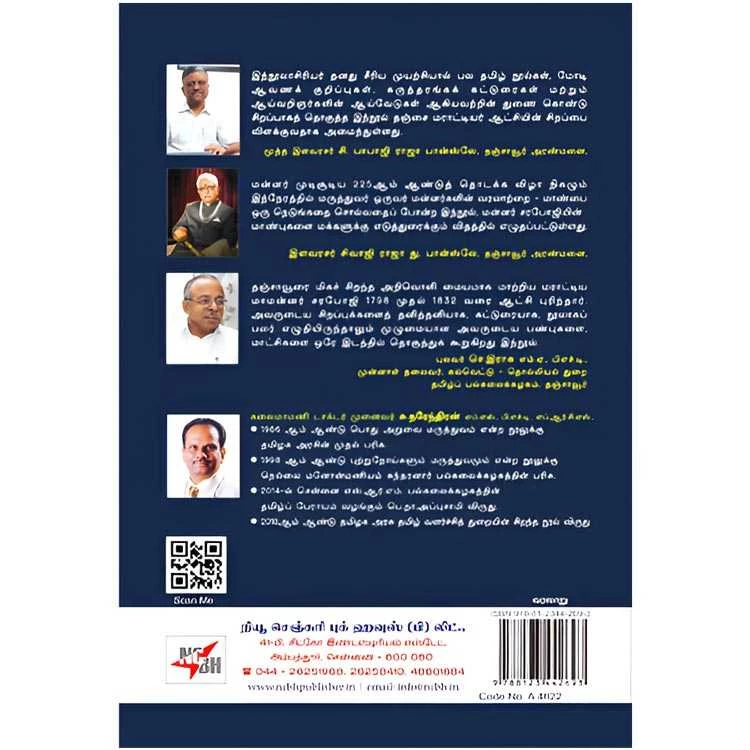 Details : Category : History Author : Dr. S. Narenthiran ISBN : 9788123442693 Weight : 200.00gm Binding : Paper Back Language : Tamil Publishing Year : 2022 Pages : 304 Code no : A4622 மன்னர் சரபோஜி : இந்நூலாசிரியர் தனது சீரிய முயற்சியால் பல தமிழ் நூல்கள், மோடி ஆவணக் குறிப்புகள், கருத்தரங்கக் கட்டுரைகள் மற்றும் ஆய்வறிஞர்களின் ஆய்வேடுகள் ஆகியவற்றின் துணை கொண்டு சிறப்பாகத் தொகுத்த இந்நூல் தஞ்சை மராட்டியர் ஆட்சியின் சிறப்பை விளக்குவதாக அமைந்துள்ளது. மூத்த இளவரசர் சி. பாபாஜி ராஜா பான்ஸ்லே, தஞ்சாவூர் அரண்மனை, மன்னர் முடிசூடிய 225ஆம் ஆண்டுத் தொடக்க விழா நிகழும் இந்நேரத்தில் மருத்துவர் ஒருவர் மன்னர்களின் வரமாற்றை – மாண்பை ஒரு நெடுங்கதை சொல்வதைப் போன்ற இந்நூல், மன்னர் சரபோஜியின் மாண்புகளை மக்களுக்கு எடுத்துரைக்கும் விதத்தில் எழுதப்பட்டுள்ளது. இளவரசர் சிவாஜி ராஜா து. பான்ஸ்லே, தஞ்சாவூர் அரண்மனை, தஞ்சாவூரை மிகச் சிறந்த அறிவொளி மையமாக மாற்றிய மராட்டிய மாமன்னர் சரபோஜி 1798 முதல் 1832 வரை ஆட்சி புரிந்தார். அவருடைய சிறப்புக்களைத் தனித்தனியாக, கட்டுரையாக, நூலாகப் பலர் எழுதியிருந்தாலும் முழுமையான அவருடைய பண்புகளை, மாட்சிகளை ஒரே இடத்தில் தொகுத்துக் கூறுகிறது இந்நூல். புலவர் செ.இராக எம்.ஏ., பிஎச்.டி., முன்னாள் தலைவர், கல்வெட்டு – தொல்லியல் துறை தமிழ்ப் பல்களைக்கழகம், தஞ்சாவூர் சுலைமாமணி டாக்டர் முனைவர் சு.நரேந்திரன் எம்.எஸ்., பி.எச்டி., எப்ஆர்சிஎஸ், * 1986 ஆம் ஆண்டு பொது அறுவை மருத்துவம் என்ற நூலுக்கு தமிழக அரசின் முதல் பரிசு. * 1998 ஆம் ஆண்டு புற்றுநோய்களும் மருத்துவமும் என்ற நூலுக்கு நெல்லை மனோன்மணியம் சுந்தரனார் பல்கலைக்கழகத்தின் பரிசு. * 2014-ல் சென்னை எஸ்.ஆர்.எம். பல்கலைக்கழகத்தின் தமிழ்ப் பேராயம் வழங்கும் பெ.நா.அப்புசாமி விருது. * 2018ஆம் ஆண்டு தமிழக அரசு தமிழ் வளர்ச்சித் துறையின் சிறந்த நூல் விருது |