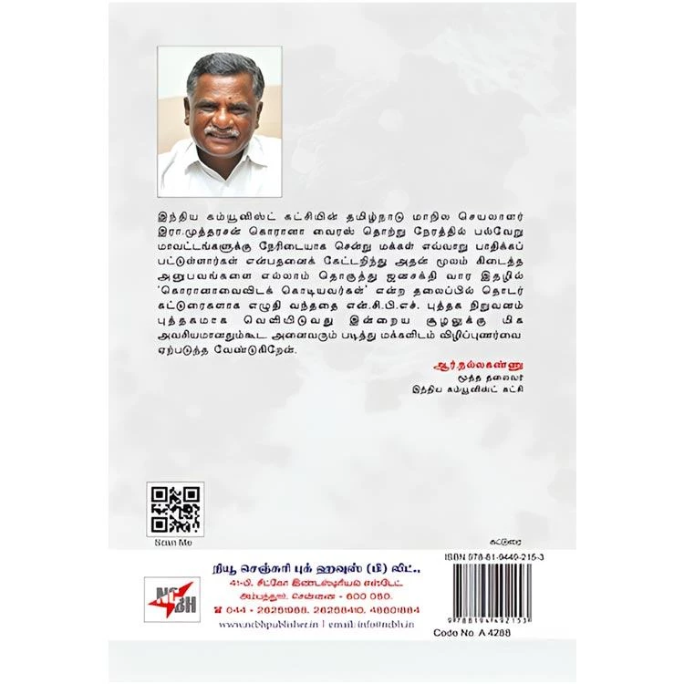 Details : Category : Essay ISBN : 9788194492153 Author : Mutharasan Weight : 100.00gm Binding : Paper back Language : Tamil Publishing Year : 2011 Code no : A4288 கொரோனாவைக் காட்டிலும் கொடியவர்கள் : இந்திய கம்யூனிஸ்ட் கட்சியின் தமிழ்நாடு மாநில செயலாளர் இரா.முத்தரசன் கொரானா வைரஸ் தொற்று நேரத்தில் பல்வேறு மாவட்டங்களுக்கு நேரிடையாக சென்று மக்கள் எவ்வாறு பாதிக்கப் பட்டுள்ளார்கள் என்பதனைக் கேட்டறிந்து அதன் மூலம் கிடைத்த அனுபவங்களை எல்லாம் தொகுத்து ஜனசக்தி வார இதழில் ‘கொரானாவைவிடக் கொடியவர்கள்’ என்ற தலைப்பில் தொடர் கட்டுரைகளாக எழுதி வந்ததை என்.சி.பி.எச். புத்தக நிறுவனம் புத்தகமாக வெளியிடுவது இன்றைய சூழலுக்கு மிக அவசியமானதும்கூட. அனைவரும் படித்து மக்களிடம் விழிப்புணர்வை ஏற்படுத்த வேண்டுகிறேன். ஆர்.நல்லகண்ணு மூத்த தலைவர் இந்திய கம்யூனிஸ்ட் கட்சி |
