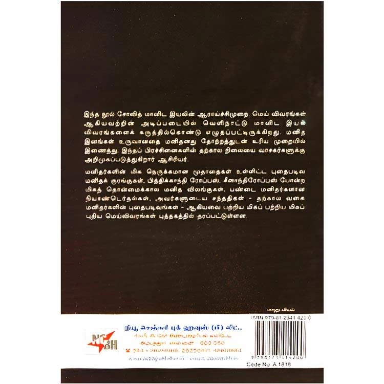 Details : ISBN : 9798123414200 Author : Mikhail Nesturkh Weight : 100.00 gm Binding : Paper Back Language : Tamil Publishing Year : 2008 Pages : 254 Code no : A1818 மனித இனங்கள் : இந்த நூல் சோவித் மானிட இயலின் ஆராய்ச்சிமுறை, மெய் விவரங்கள் ஆகியவற்றின் அடிப்படையில் வெளிநாட்டு மானிட இயல். விவரங்களைக் கருத்தில்கொண்டு எழுதப்பட்டிருக்கிறது மனித இனங்கள் உருவானதை மனிதனது தோற்றத்துடன் உரிய முறையில் இணைத்து, இந்தப் பிரச்சினைகளின் தற்கால நிலையை வாசகர்களுக்கு அறிமுகப்படுத்துகிறார் ஆசிரியர் மனிதர்களின் மிக நெருக்கமான மூதாதைகள் உள்ளிட்ட புதைபடிவ மனிதக் குரங்குகள், பித்திக்காந்தி ரோப்பஸ் சீனாந்திரோப்பஸ் போன்ற மிகத் தொன்மைக்கால மனித விலங்குகள் பண்டை மனிதர்களான நியாண்டெர்தல்கள், அவர்களுடைய சந்ததிகள் தற்கால வகை மனிதர்களின் புதைபடிவங்கள் – ஆகியவை பற்றிய மிகப் பற்றிய மிகப் புதிய மெய்விவரங்கள் புத்தகத்தில் தரப்பட்டுள்ளன |