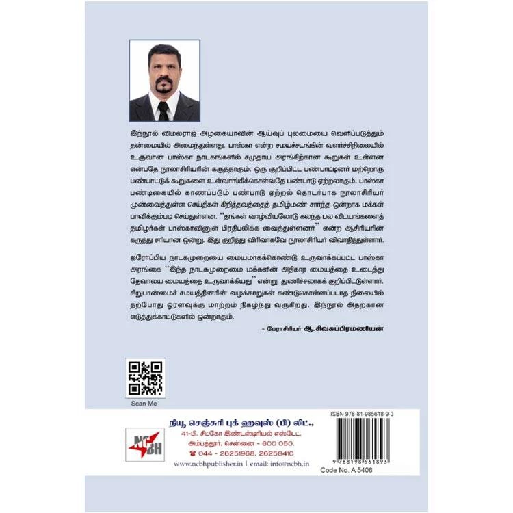 Details : Book Name: A5406 Regional Name: பாஸ்கா நாடகம் – அரங்கியலும் அரசியலும் Author: அழகையா விமலராஜ் Edition: 1st Edition ISBN: 978-81-985618-9-3 Category: General Binding: Paper Binding Language: Tamil Publishing Year: 2025 Pages: 360 Code No: A5406 இந்நூல் விமலராஜ் அழகையாவின் ஆய்வுப் புலமையை வெளிப்படுத்தும் தன்மையில் அமைந்துள்ளது. பாஸ்கா என்ற சமயச்சடங்கின் வளர்ச்சிநிலையில் உருவான பாஸ்கா நாடகங்களில் சமுதாய அரங்கிற்கான கூறுகள் உள்ளன என்பதே நூலாசிரியரின் கருத்தாகும். ஒரு குறிப்பிட்ட பண்பாட்டினர் மற்றொரு பண்பாட்டுக் கூறுகளை உள்வாங்கிக்கொள்வதே பண்பாடு ஏற்றலாகும். பாஸ்கா பண்டிகையில் காணப்படும் பண்பாடு ஏற்றல் தொடர்பாக நூலாசிரியர் முன்வைத்துள்ள செய்திகள் கிறித்தவத்தைத் தமிழ்மண் சார்ந்த ஒன்றாக மக்கள் பாவிக்கும்படி செய்துள்ளன. “தங்கள் வாழ்வியலோடு கலந்த பல விடயங்களைத் தமிழர்கள் பாஸ்காவினுள் பிரதிபலிக்க வைத்துள்ளனர்” என்ற ஆசிரியரின் கருத்து சரியான ஒன்று. இது குறித்து விரிவாகவே நூலாசிரியர் விவாதித்துள்ளார். ஐரோப்பிய நாடகமுறையை மையமாகக்கொண்டு உருவாக்கப்பட்ட பாஸ்கா அரங்கை “இந்த நாடகமுறைமை மக்களின் அதிகார மையத்தை உடைத்து தேவாலய மையத்தை உருவாக்கியது என்று துணிச்சலாகக் குறிப்பிட்டுள்ளார். சிறுபான்மைச் சமயத்தினரின் வழக்காறுகள் கண்டுகொள்ளப்படாத நிலையில் தற்போது ஓரளவுக்கு மாற்றம் நிகழ்ந்து வருகிறது. இந்நூல் அதற்கான எடுத்துக்காட்டுகளில் ஒன்றாகும். பேராசிரியர் ஆ.சிவசுப்பிரமணியன்இந்நூல் விமலராஜ் அழகையாவின் ஆய்வுப் புலமையை வெளிப்படுத்தும் தன்மையில் அமைந்துள்ளது. பாஸ்கா என்ற சமயச்சடங்கின் வளர்ச்சிநிலையில் உருவான பாஸ்கா நாடகங்களில் சமுதாய அரங்கிற்கான கூறுகள் உள்ளன என்பதே நூலாசிரியரின் கருத்தாகும். ஒரு குறிப்பிட்ட பண்பாட்டினர் மற்றொரு பண்பாட்டுக் கூறுகளை உள்வாங்கிக்கொள்வதே பண்பாடு ஏற்றலாகும். பாஸ்கா பண்டிகையில் காணப்படும் பண்பாடு ஏற்றல் தொடர்பாக நூலாசிரியர் முன்வைத்துள்ள செய்திகள் கிறித்தவத்தைத் தமிழ்மண் சார்ந்த ஒன்றாக மக்கள் பாவிக்கும்படி செய்துள்ளன. “தங்கள் வாழ்வியலோடு கலந்த பல விடயங்களைத் தமிழர்கள் பாஸ்காவினுள் பிரதிபலிக்க வைத்துள்ளனர்” என்ற ஆசிரியரின் கருத்து சரியான ஒன்று. இது குறித்து விரிவாகவே நூலாசிரியர் விவாதித்துள்ளார். ஐரோப்பிய நாடகமுறையை மையமாகக்கொண்டு உருவாக்கப்பட்ட பாஸ்கா அரங்கை “இந்த நாடகமுறைமை மக்களின் அதிகார மையத்தை உடைத்து தேவாலய மையத்தை உருவாக்கியது என்று துணிச்சலாகக் குறிப்பிட்டுள்ளார். சிறுபான்மைச் சமயத்தினரின் வழக்காறுகள் கண்டுகொள்ளப்படாத நிலையில் தற்போது ஓரளவுக்கு மாற்றம் நிகழ்ந்து வருகிறது. இந்நூல் அதற்கான எடுத்துக்காட்டுகளில் ஒன்றாகும். பேரா