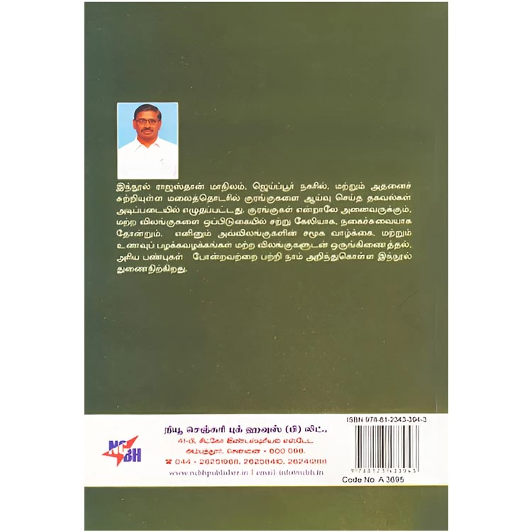 Details : ISBN : 9788123433943 Author : Prof.P. Ram Manohar Weight : 100.00 gm Binding : Paper Back Language : Tamil Code no : A3695 ஆரவல்லி மலைத்தொடரின் அழகிய குரங்குகள் : இந்நூல் ராஜஸ்தான் மாநிலம் ,ஜெய்ப்பூர் நகரில் ,மற்றும் அதனைச் சுற்றியுள்ள மலைத்தொடரில் குரங்குகளை ஆய்வு செய்த தகவல்கள் அடிப்படையில் எழுதப்பட்டது. குரங்குகள் என்றாலே அனைவருக்கும், மற்ற விலங்குகளை ஒப்பிடுகையில் சற்றி கேலியாக ,நகைச்சுவையாக தோன்றும். எனினும் அவ்விலங்குகளின் சமூக வாழ்க்கை ,மற்றும் உணவுப் பழக்கவழக்கங்கள் மற்ற விலங்குகளுடன் ஒருங்கிணைத்தல், அரிய பண்புகள் போன்றவற்றை பற்றி நாம் அறிந்துகொள்ள இந்நூல் துணைநிற்கிறது. |