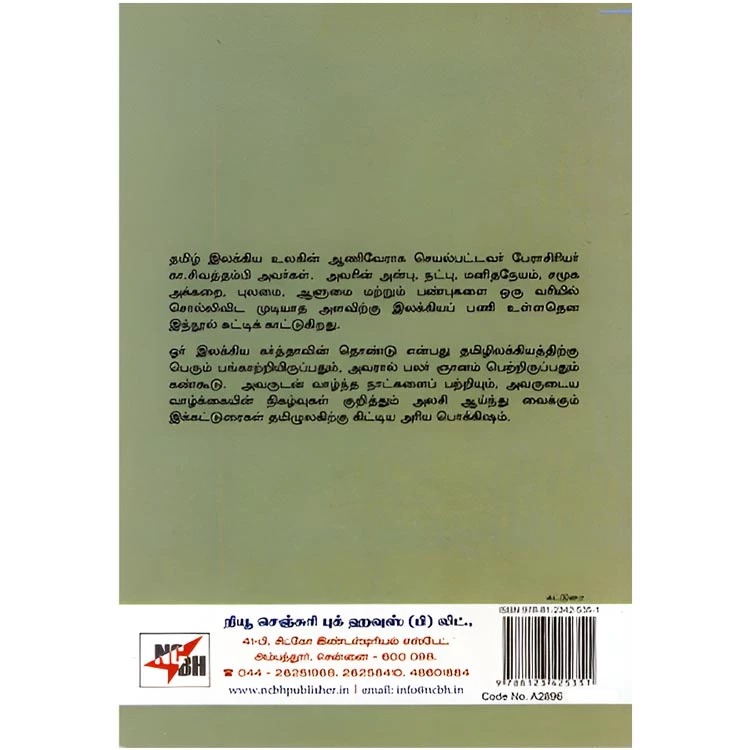 Details : Edition : 1 Category : Essay ISBN : 9788123425351 Author : Theniyaan Weight : 100gm Binding : Paper back Language : Tamil Publishing Year : 2013 Pages : 126 Code no : A2896 பேராசிரியர் கா.சிவத்தம்பி : தமிழ் இலக்கிய உலகின் ஆணிவேராக செயல்பட்டவர் பேராசிரியர் கா.சிவத்தம்பி அவர்கள். அவரின் அன்பு, நட்பு, மனிதநேயம், சமூக அக்கறை, புலமை. ஆளுமை மற்றும் பண்புகளை ஒரு வரியில் சொல்லிவிட முடியாத அளவிற்கு இலக்கியப் பணி உள்ளதென இந்நூல் சுட்டிக் காட்டுகிறது. ஓர் இலக்கிய கர்த்தாவின் தொண்டு என்பது தமிழிலக்கியத்திற்கு பெரும் பங்காற்றியிருப்பதும், அவரால் பலர் ஞானம் பெற்றிருப்பதும் கண்கூடு. அவருடன் வாழ்ந்த நாட்களைப் பற்றியும், அவருடைய வாழ்க்கையின் நிகழ்வுகள் குறித்தும் அலசி ஆய்ந்து வைக்கும் இக்கட்டுரைகள் தமிழுலகிற்கு கிட்டிய அரிய பொக்கிஷம். நெஞ்சில் பதிந்துள்ள நினைவுகளில் |