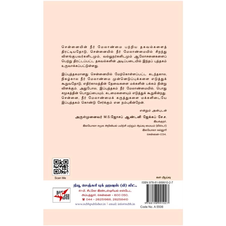Details : Book Name: Chennaiyin Neeriyiyal Varalaarum Athan Melanmaiyum Regional Name: சென்னையின் நீரியியல் வரலாறும் அதன் மேலாண்மையும் Author: இலயோலா சமூக அறிவியல் பயிற்சி மற்றும் ஆய்வு மையம் (லிஸ்டர்) Edition: 1st Edition ISBN: 978-81-989910-2-7 Category: History Binding: Paper Binding Language: Tamil Publishing Year: 2025 Pages: 194 Code No: A5506 சென்னையின் நீர் மேலாண்மை பற்றிய தகவல்களைத் திரட்டியதோடு, சென்னையில் நீர் மேலாண்மையில் சிறந்து விளங்குபவர்களிடமும், வல்லுநர்களிடமும் ஆலோசனைகளைப் j பெற்று திரட்டப்பட்ட தகவல்களின் அடிப்படையில் இந்தப் புத்தகம் உருவாக்கப்பட்டுள்ளது. இப்புத்தகமானது சென்னையில் மேற்கொள்ளப்பட்ட கடந்தகால, நிகழ்கால நீர் மேலாண்மை முன்னெடுப்புக்களை எடுத்துக் கூறுவதோடு, எதிர்காலத்தின் தேவைகளை மக்களின் பக்கம் நின்று விளக்கும். அதுபோல, இப்புத்தகம் நீர் மேலாண்மையில், பொது 9 சமூகத்தின் பொறுப்பையும், கடமைகளையும் எடுத்துக் கூறுகின்றது. சென்னை, நீர் மேலாண்மைக் கருத்துகளை மக்களிடையே இப்புத்தகம் கொண்டு சேர்க்கும் என நம்புகின்றேன். என்றும் அன்புடன் அருள்முனைவர் M.S.ஜோசப் ஆண்டனி ஜேக்கப் சே.ச. இயக்குநர். இலயோலா சமூக அறிவியல் பயிற்சி மற்றும் ஆய்வு மையம் (விஸ்டர்) இலயோலா கல்லூரி சென்னை-034. |
