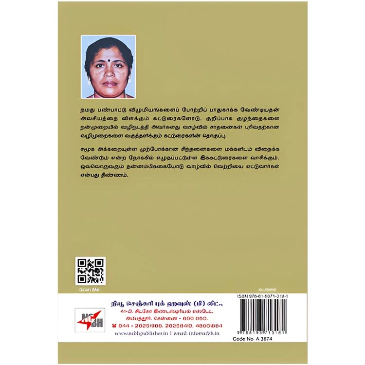 Details : Category : Essay ISBN : 9788193713181 Author : Dr. K. Sellathaai Weight : 100.00 gm Binding : Paper Back Language : Tamil Publishing Year : 2008 Pages : 52 Code no : A3874 சாதனை புரியத் தயாரா :சாதனை புரியத் தயாரா : நமது பண்பாட்டு விழுமியங்களைப் போற்றிப் பாதுகாக்க வேண்டியதன் அவசியத்தை விளக்கும் கட்டுரைகளோடு. குறிப்பாக குழந்தைகளை சாதனை புரியத் தயாரா… நன்முறையில் வழிநடத்தி அவர்களது வாழ்வில் சாதனைகள் புரிவதற்கான வழிமுறைகளை வகுத்தளிக்கும் கட்டுரைகளின் தொகுப்பு. சமூக அக்கறையுள்ள முற்போக்கான சிந்தனைகளை மக்களிடம் விதைக்க வேண்டும் என்ற நோக்கில் எழுதப்பட்டுள்ள இக்கட்டுரைகளை வாசிக்கும். ஒவ்வொருவரும் தன்னம்பிக்கையோடு வாழ்வில் வெற்றியை எட்டுவார்கள் என்பது திண்ணம். |