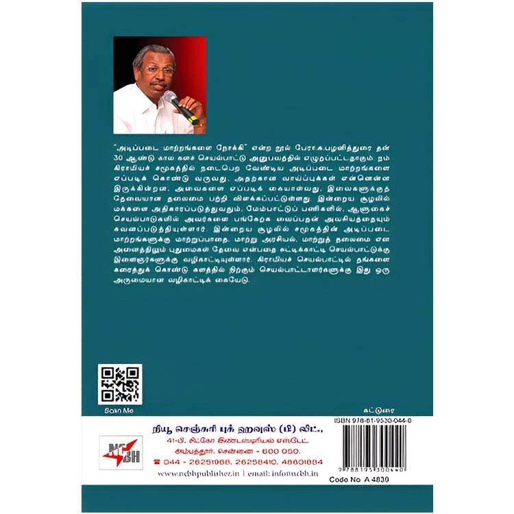 Details : Category : Essay ISBN : 9788195300440 Author : K. Pazhanidurai Weight : 100.00 gm Binding : Paper Back Language : Tamil Publishing Year : 2023 Pages : 144 Code no : A4839 அடிப்படை மாற்றங்களை நோக்கி : அடிப்படை மாற்றங்களை நோக்கி என்ற நூல் பேரா.க.பழனித்துரை தன் 30 ஆண்டு கால களச் செயல்பாட்டு அனுபவத்தில் எழுதப்பட்டதாகும் நம் கிராமியச் சமூகத்தில் நடைபெற வேண்டிய அடிப்படை மாற்றங்களை எப்படிக் கொண்டு வருவது, அதற்கான வாய்ப்புக்கள் என்னென்ன இருக்கின்றன அவைகளை எப்படிக் கையாள்வது, இவைகளுக்குத் தேவையான தலைமை பற்றி விளக்கப்பட்டுள்ளது. இன்றைய சூழலில் மக்களை அதிகாரப்படுத்துவதும், மேம்பாட்டுப் பணிகளில், ஆளுகைச் செயல்பாடுகளில் அவர்களை பங்கேற்க வைப்பதன் அவசியத்தையும் கவனப்படுத்தியுள்ளார். இன்றைய சூழலில் சமூகத்தின் அடிப்படை மாற்றங்களுக்கு மாற்றுப்பாதை, மாற்று அரசியல், மாற்றுத் தலைமை என அனைத்திலும் புதுமைகள் தேவை என்பதை சுட்டிக்காட்டி செயல்பாட்டுக்கு இளைஞர்களுக்கு வழிகாட்டியுள்ளார். கிராமியச் செயல்பாட்டில் தங்களை கரைத்துக் கொண்டு களத்தில் நிற்கும் செயல்பாட்டாளர்களுக்கு இது ஒரு அருமையான வழிகாட்டிக் கையேடு. |