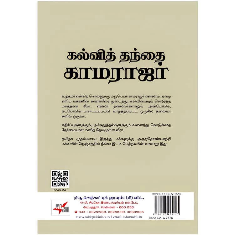 Details : Book Title : கல்வித் தந்தை காமராஜர் (Kalvi thandhai kamarajar) Edition : 3 ISBN : 9788123424125 Author : Dr.B. Balasubramanian Weight : 100.00 gm Binding : Paper Back Language : Tamil Pages : 86 Publishing Year : 2023 Code no : A2776 கல்வித் தந்தை காமராஜர் : கல்வித் தந்தை காமராஜர் உத்தமர் என்கிற சொல்லுக்கு மறுபெயர் காமராஜர் எனலாம். ஏழை எளிய மக்களின் கண்ணீரை துடைத்து, கல்வியையும் கொடுத்த மகத்தான சீலர். எல்லா தலைவர்களாலும் அன்போடும், நட்போடும் பாராட்டப்பட்டு வாழ்த்தப்பட்ட ஒருசில தலைவர் களில் ஒருவர். எதிர்ப்புகளுக்கும், அச்சுறுத்தல்களுக்கும் வளைந்து கொடுக்காத நேர்மையான மனித நேயமுள்ள வீரர், தமிழக முதல்வராய் இருந்து மக்களுக்கு அருந்தொண்டாற்றி மக்களின் நெஞ்சத்தில் நீங்கா இடம் பெற்றவரின் வரலாறு இது. |