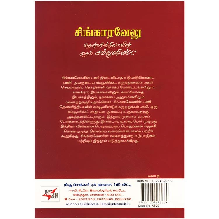 Details : ISBN : 9798123413623 Author : K.Murugesan,C.S.Subramani Weight : 100.00 gm Binding : Paper Back Language : Tamil Publishing Year : 1991 Code no : A520 Pages :504 சிங்காரவேலு -தென்னிந்தியாவின் முதல் கம்யூனிஸ்ட் : சிங்காரவேலரின் பணி இடைவிடாத ஈடுபாடுகொண்ட பணி. அவருடைய கம்யூனிஸ்ட் கருத்துக்களை அவர் செயலாற்றிய தொழிலாளி வர்க்கப் போராட்டங்களிலும். காங்கிரஸ் இயக்கங்களிலும், சுயமரியாதை இயக்கத்திலும், நகரசபை அலுவல்களிலும் கவனத்துக்குரியதாக்கினார். சிங்காரவேலரின் பணி தென்னிந்தியாவில் கம்யூனிஸ்டுக் கருத்துக்கள்பரவி, ஒரு கம்யூனிஸ்ட் ஸ்தாபன அமைப்பு உருவாவதற்கு அடித்தளமிட்டதாகும். இந்நூல் முதலாம் உலகப் போர்க்காலத்திலிருந்து இரண்டாம் உலகப் போர் முடிந்து இந்தியா விடுதலை பெறுவதற்குப் பொதுமக்கள் எழுச்சி கொண்டிருந்த நிலைமை வரையிலான காலம் பற்றிக் கூறுகிறது. சிங்காரவேலரின் எல்லாத்துறை ஈடுபாடுகள் பற்றியும் இந்நூல் எடுத்துரைக்கிறது. |