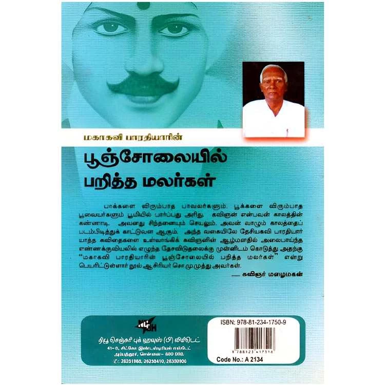Details : ISBN : 9788123417509 Author : CHO.M. Muthu Weight : 100.00 gm Binding : Paper Back Language : Tamil Publishing Year : 2010 Code no : A2134 Pages : 100 பூஞ்சோலையில் பறித்த மலர்கள் : பாக்களை விரும்பாத பாவலர்களும், பூக்களை விரும்பாத பூவையர்களும் பூமியில் பார்ப்பது அரிது. கவிஞன் என்பவன் காலத்தின் கண்ணாடி அவனது சிந்தனையும் செயலும். அவன் வாழும் காலத்தைப் படம்பிடித்துக் காட்டுவன ஆகும். அந்த வகையிலே தேசியகவி பாரதியார் யாத்த கவிதைகளை உள்வாங்கிக் கவிஞனின் ஆழ்மனதில் அவைபாய்ந்த எண்ணக்குவியலில் எழுந்த தேசவிடுதலைக்கு முன்னிடம் கொடுத்து அதற்கு “மகாகவி பாரதியாரின் பூஞ்சோலையில் பறித்த மலர்கள் என்று பெயரிட்டுள்ளார் நூல் ஆசிரியர் சொ.மு.முத்து அவர்கள். கவிஞர் மழைமகன் |