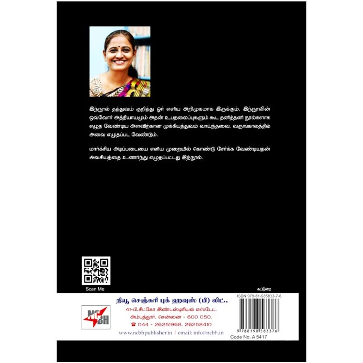Details : Book Name: Thathuvam Oor Eliya Arimugam Regional Name: தத்துவம் ஓர் எளிய அறிமுகம் Author: ஜி.மஞ்சுளா Edition: 1st Edition ISBN: 978-81-985833-7-6 Category: Essay Binding: Paper Binding Language: Tamil Publishing Year: 2025 Pages: 78 Code No: A5417 தத்துவம் ஓர் எளிய அறிமுகம் : இந்நூல் தத்துவம் குறித்து ஓர் எளிய அறிமுகமாக இருக்கும். இந்நூலின் ஒவ்வோர் அத்தியாயமும் அதன் உபதலைப்புகளும் கூட தனித்தனி நூல்களாக எழுத வேண்டிய அளவிற்கான முக்கியத்துவம் வாய்ந்தவை. வருங்காலத்தில் அவை எழுதப்பட வேண்டும். மார்க்சிய அடிப்படையை எளிய முறையில் கொண்டு சேர்க்க வேண்டியதன் அவசியத்தை உணர்ந்து எழுதப்பட்டது இந்நூல். |