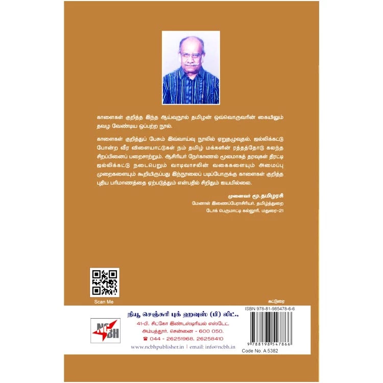 Details : Book Name : Jallikkattum Kaalaigalum Regional Name : ஜல்லிக்கட்டும் காளைகளும் Author : கே.கே.ராஜன் Edition : 1st Edition ISBN : 978-81-985478-6-6 Category : Essays Binding : Paper Binding Language : Tamil Publishing Year : 2025 Pages : 72 Code No : A5382 ஜல்லிக்கட்டும் காளைகளும் : காளைகள் குறித்த இந்த ஆய்வுநூல் தமிழன் ஒவ்வொருவரின் கையிலும் தவழ வேண்டிய ஒப்பற்ற நூல். காளைகள் குறித்துப் பேசும் இவ்வாய்வு நூலில் ஏறுதழுவுதல், ஜல்லிக்கட்டு போன்ற வீர விளையாட்டுகள் நம் தமிழ் மக்களின் ரத்தத்தோடு கலந்த சிறப்பினைப் பறைசாற்றும், ஆசிரியர் நேர்காணல் மூலமாகத் தரவுகள் திரட்டி ஜல்லிக்கட்டு நடைபெறும் வாடிவாசலின் வகைகளையும் அமைப்பு முறைகளையும் கூறியிருப்பது இந்நூலைப் படிப்போருக்கு காளைகள் குறித்த புதிய பரிமாணத்தை ஏற்படுத்தும் என்பதில் சிறிதும் ஐயமில்லை. முனைவர் மூ.தமிழரசி மேனாள் இணைப்பேராசிரியர். தமிழ்த்துறை டோக் பெருமாட்டி கல்லூரி, மதுரை-21 |