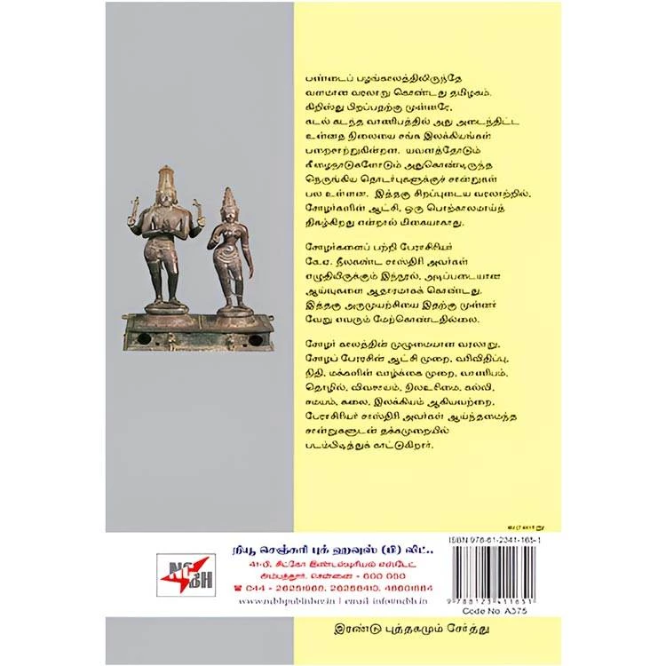 Details : Edition : 5 Category : History , Novel ISBN : 9788123411651 Author : K.A. Neelakanda Sasthri Weight : 800.00gm Binding : Hard Bound Language : Tamil Publishing Year : 1989 Pages : 1240 Code no : A375 சோழர்கள் : பண்டைப் பழங்காலத்திலிருந்தே வளமான வரலாறு கொண்டது தமிழகம். கிறிஸ்து பிறப்பதற்கு முன்னரே. கடல் கடந்த வாணிபத்தில் அது அடைந்திட்ட உள்ளத நிலையை சங்க இலக்கியங்கள் பறைசாற்றுகின்றன. யவளத்தோடும் கீழைநாடுகளோடும் அதுகொண்டிருந்த நெருங்கிய தொடர்புகளுக்குச் சான்றுகள் பல உள்ளன. இத்தரு சிறப்புடைய வரலாற்றில், சோழர்களின் ஆட்சி, ஒரு பொற்காலமாய்த் திகழ்கிறது என்றால் மிகையாகாது. சோழர்களைப் பற்றி பேராசிரியர் கே.ஏ. நீலகண்ட சாஸ்திரி அவர்கள் எழுதியிருக்கும் இந்நூல், அடிப்படையான ஆய்வுகளை ஆதாரமாகக் கொண்டது, இத்தகு அருமுயற்சியை இதற்கு முன்னர் வேறு எவரும் மேற்கொண்டதில்லை. சோழர் காலத்தின் முழுமையான வரலாறு, சோழப் பேரரசின் ஆட்சி முறை, வரிவிதிப்பு, நிதி, மக்களின் வாழ்க்கை முறை, வாணிபம், தொழில், விவசாயம், நிலஉரிமை, கல்வி, சமயம், கலை, இலக்கியம் ஆகியவற்றை, பேராசிரியர் சாஸ்திரி அவர்கள் ஆய்ந்தமைந்த சான்றுகளுடன் தக்கமுறையில் படம்பிடித்துக் காட்டுகிறார். |