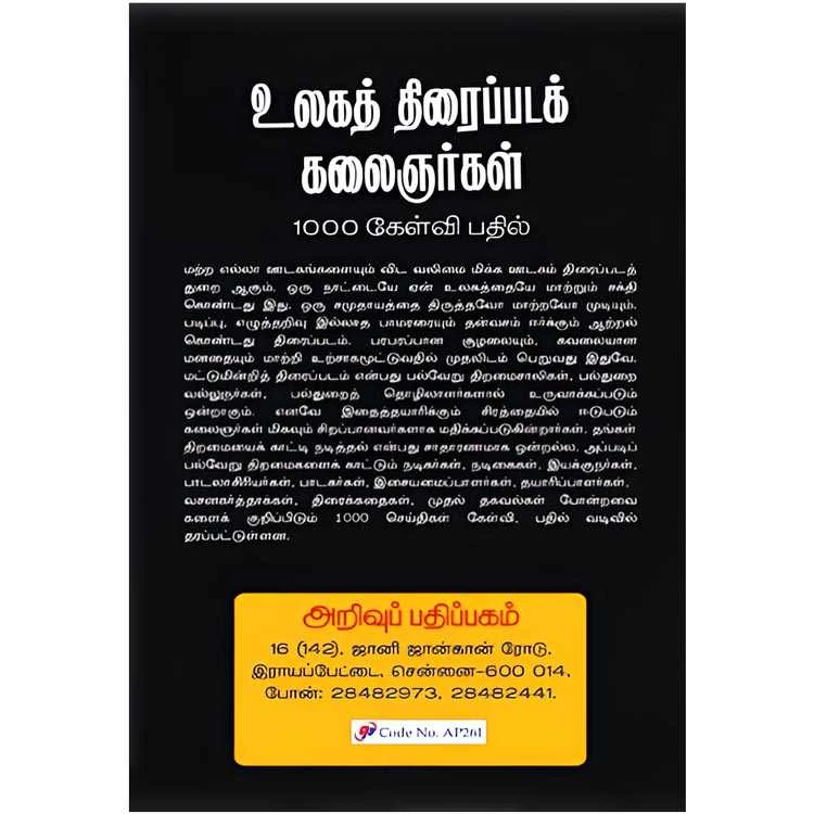 Details : Category : cinema Author : S. Ananthakumar Weight : 100.00 gm Binding : Paper Back Language : Tamil Publishing Year : 2012 Pages : 114 Code no : AP261 உலகத் திரைப்படக் கலைஞர்கள் : மற்ற எல்லா ஊடகங்களையும் விட வலிமை மிக்க ஊடகம் திரைப்படத்துறை ஆகும். ஒரு நாட்டையே ஏன் உலகத்தையே மாற்றும் சக்தி கொண்டது இது. ஒரு சமுதாயத்தை திருத்தவோ மாற்றவோ முடியும். படிப்பு, எழுத்தறிவு இல்லாத பாமரரையும் தன்வசம் ஈர்க்கும் ஆற்றல் கொண்டது திரைப்படம். பரபரப்பான சூழலையும், கவலையான மனதையும் மாற்றி உற்சாகமூட்டுவதில் முதலிடம் பெறுவது இதுவே. மட்டுமின்றித் திரைப்படம் என்பது பல்வேறு திறமைசாலிகள், பல்துறை வல்லுநர்கள், பல்துறைத் தொழிலாளர்களால் உருவாக்கப்படும் ஒன்றாகும். எனவே இதைத்தயாரிக்கும் சிரத்தையில் ஈடுபடும் கலைஞர்கள் மிகவும் சிறப்பானவர்களாக மதிக்கப்படுகின்றார்கள். தங்கள் திறமையைக் காட்டி நடித்தல் என்பது சாதாரணமாக ஒன்றல்ல. அப்படிப் பல்வேறு திறமைகளைக் காட்டும் நடிகர்கள், நடிகைகள், இயக்குநர்கள், பாடலாசிரியர்கள், பாடகர்கள், இசையமைப்பாளர்கள், தயாரிப்பாளர்கள், வசனகர்த்தாக்கள், திரைக்கதைகள், முதல் தகவல்கள் போன்றவை களைக் குறிப்பிடும் 1000 செய்திகள் கேள்வி, பதில் வடிவில்தரப்பட்டுள்ளன. |