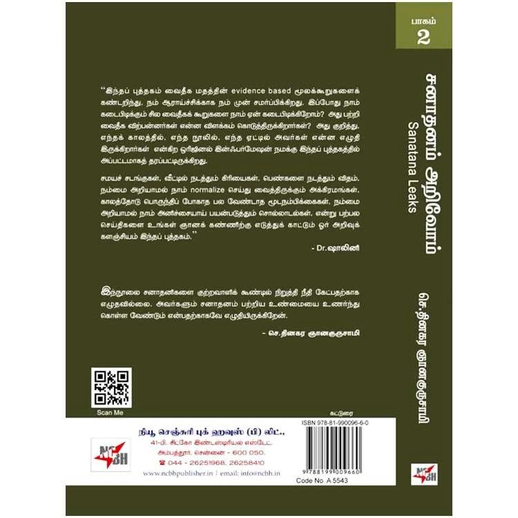Details : Author: செ.தினகர ஞானகுருசாமி Edition: 1st Edition ISBN: 978-81-990096-6-0 Category: Essays Binding: Paper Binding Language: Tamil Publishing Year: 2025 Pages: 504 Code No: A5543 சனாதனம் : “இந்தப் புத்தகம் வைதீக மதத்தின் evidence based மூலக்கூறுகளைக் கண்டறிந்து, நம் ஆராய்ச்சிக்காக நம் முன் சமர்ப்பிக்கிறது. இப்போது நாம் கடைபிடிக்கும் சில வைதீகக் கூறுகளை நாம் ஏன் கடைபிடிக்கிறோம்? அது பற்றி வைதீக விற்பன்னர்கள் என்ன விளக்கம் கொடுத்திருக்கிறார்கள்? அது குறித்து, எந்தக் காலத்தில், எந்த நூலில், எந்த ஏட்டில் அவர்கள் என்ன எழுதி இருக்கிறார்கள் என்கிற ஒரிஜினல் இன்ஃபர்மேஷன் நமக்கு இந்தப் புத்தகத்தில் அப்பட்டமாகத் தரப்பட்டிருக்கிறது. சமயச் சடங்குகள். வீட்டில் நடத்தும் கிரியைகள், பெண்களை நடத்தும் விதம், நம்மை அறியாமல் நாம் normalize செய்து வைத்திருக்கும் அக்கிரமங்கள். காலத்தோடு பொருந்திப் போகாத பல வேண்டாத மூடநம்பிக்கைகள், நம்மை அறியாமல் நாம் அனிச்சையாய் பயன்படுத்தும் சொல்லாடல்கள். என்று பற்பல செய்திகளை உங்கள் ஞானக் கண்ணிற்கு எடுத்துக் காட்டும் ஓர் அறிவுக் களஞ்சியம் இந்தப் புத்தகம்,” – Dr.ஷாலினி இந்நூலை சனாதனிகளை குற்றவாளிக் கூண்டில் நிறுத்தி நீதி கேட்பதற்காக எழுதவில்லை. அவர்களும் சனாதனம் பற்றிய உண்மையை உணர்ந்து கொள்ள வேண்டும் என்பதற்காகவே எழுதியிருக்கிறேன். செ.தினகர ஞானகுருசாமி |