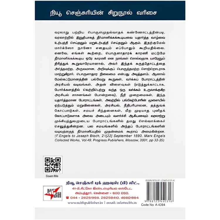 Details : Category : Marxism ISBN : 9788123440316 Author : Marcello Musto Translator : S. V. Raja durai Weight : 100.00 gm Binding : Paper Back Language : Tamil Publishing Year : Code no : A4384 எங்கெல்ஸ் 200 பங்களிப்புகளும் வரம்புகளும் : வரலாறு பற்றிய பொருள்முதல்வாதக் கண்ணோட்டத்தின்படி. வரலாற்றில் இறுதியாகத் தீர்மானிக்கக்கூடியவை யதார்த்த வாழ்வை உற்பத்தி செய்தலும் மறுஉற்பத்தி செய்தலும் ஆகும். இதற்குமேல் மார்க்ஸோ நானோ எதையும் எப்போதும் கூறியதில்லை. எனவே. எங்கள் கூற்றை. பொருளாதாரக் காரணி மட்டுமே தீர்மானிக்கக்கூடிய ஒரே காரணி என நாங்கள் சொல்வதாக யாரேனும் திரித்துக் கூறுவாரேயானால். அவர் இந்தக் கருத்தோட்டத்தை அர்த்தமற்ற, அருவமான. அறிவுக்குப் பொருத்தமற்ற சொற்றொடராக மாற்றுகிறார். பொருளாதார நிலைமை என்பது அடித்தளம். ஆனால் மேல்கட்டுமானத்தின் பல்வேறு கூறுகள், வர்க்கப் போராட்டத்தின் அரசியல் வடிவங்கள், அதன் விளைவுகள் (எடுத்துக்காட்டாக, போர்க்களத்தில் வெற்றிபெற்று வந்த ஒரு வர்க்கம் உருவாக்குகிற அரசியல் சாசனங்கள் போன்றவை), நீதி முறைமைகள், இந்த யதார்த்தமான போராட்டங்கள். அவற்றில் பங்கேற்போரின் மூளையில் ஏற்படுத்தும் மறுவினைகள், அரசியல். நீதிபரிபாலன. தத்துவக் கோட்பாடுகள். சமயச் சிந்தனைகள், மீற முடியாத புனிதக் கோட்பாடுகளாக அவை அடையும் வளர்ச்சி ஆகியனவும் வரலாற்று முக்கியத்துவமுடைய போராட்டங்களில் தமது செல்வாக்கைச் செலுத்துகின்றன. பல சமயங்களில் அந்தப் போராட்டங்களின் வடிவத்தைத் தீர்மானிப்பதில் முதன்மைக் கூறாய் அமைகின்றன. |
