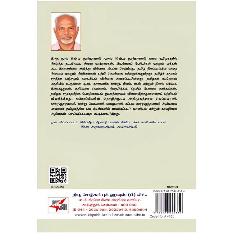 Details : ISBN : 9788123444314 Author : S. Jayaseela Stephen Translator : K. Ilangovan Weight : 100.00 gm Binding : Paper Back Language : Tamil Publishing Year : 2023 Code no : A4785 இந்த நூல் 9ஆம் நூற்றாண்டு முதல் 19ஆம் நூற்றாண்டு வரை தமிழகத்தில் நிகழ்ந்த தட்பவெப்ப நிலை மாற்றங்கள். இயற்கைப் பேரிடர்கள் மற்றும் மக்கள் பட்ட இன்னல்கள் குறித்து விரிவாக ஆய்வு செய்கிறது. தமிழ் நிலப்பரப்பில் மழை நிலவரம் மற்றும் நீர்நிலைகள் பற்றி தெளிவாக எடுத்துக்கூறுகிறது. தமிழ்ச் சமூகம் சந்தித்த பஞ்சமும் வறட்சியும் விரிவாக அலசப்பட்டுள்ளது. தமிழகக் கடலோரப் பகுதியில் உருவான புயல். சூறாவளிக் காற்று. நிலம், கடல் மற்றும் நீரால் ஏற்பட்ட இடையுறுகள், குறிப்பாக வெள்ளம், நிலநடுக்கம், நெடும் பேரலை தாக்கங்கள், தமிழக சமூகத்திற்கு பேரழிவையும் துயரத்தையும் விளைவித்ததுள்ளதைப் பற்றியும் விவரிக்கிறது. ஐரோப்பியரின் தொழிற்நுட்ப அறிமுகத்தால் வெப்பமானி. காற்றழுத்தமானி, காற்று வேகமானி, மழைமானி, கப்பல் காற்றழுத்தமானி ஆகியவை பரவலாக தமிழகத்தின் பல இடங்களில் வைக்கப்பட்டு வானியல் மற்றும் காலநிலை ஆய்வுகள் செய்யப்பட்டதை சுட்டிக்காட்டுகிறது. முன் அட்டைப்படம்: 1680ஆம் ஆண்டு புயலில் சிக்கிய டச்சுக் கம்பெனிக் கப்பல் (ரிக்ஸ் அருங்காட்சியகம், ஆம்ஸ்டர்டேம்) |
