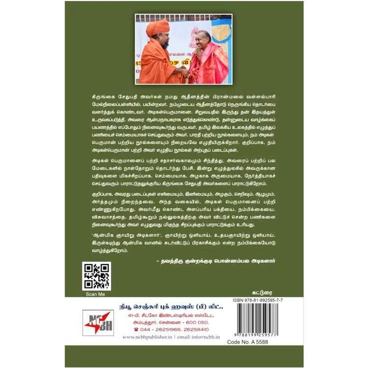 Details : Author : கிருங்கை சேதுபதி Edition : 1st Edition ISBN : 978-81-992595-7-7 Category : Essays Binding : Paper Binding Language : Tamil Publishing Year : 2025 Pages : 400 Code No : A5588 ஞாயிறு அடிகளார் : கிருங்கை சேதுபதி அவர்கள் நமது ஆதீனத்தின் பிரான்மலை வள்ளல்பாரி மேல்நிலைப்பள்ளியில், பயின்றவர். நம்முடைய ஆதீனத்தோடு நெருங்கிய தொடர்பை வளர்த்துக் கொண்டவர், அடிகள்பெருமானை. சிறுவயதில் இருந்து தன் இதயத்துள் உருவகப்படுத்தி, அவரை ஆன்மநாயகராக எடுத்துக்கொண்டு, தன்னுடைய வாழ்க்கைப் பயணத்தில் எப்போதும் நினைவுகூர்ந்து வருபவர். தமிழ் இலக்கிய உலகத்தில் எழுத்துப் பணியைச் செம்மையாகச் செய்துவரும் அவர். பாரதி பற்றிய நூல்களையும், நம் அடிகள் பெருமான் பற்றிய நூல்களையும் நிறையவே எழுதியிருக்கிறார். குறிப்பாக, நம் அடிகள்பெருமான் பற்றி அவர் எழுதிய நூல்கள் அற்புதப் படைப்புகள். அடிகள் பெருமானைப் பற்றி சதாசர்வகாலமும் சிந்தித்து, அவரைப் பற்றிப் பல மேடைகளில் நாள்தோறும் தொடர்ந்து பேசி. இன்று எழுத்துலகில் அவருக்கான பதிவுகளை மிகச்சிறப்பாக, செம்மையாக. அழகாக அருமையாக, நேர்த்தியாகச் செய்துவரும் பாராட்டுதலுக்குரிய கிருங்கை சேதுபதி அவர்களைப் பாராட்டுகிறோம். குறிப்பாக, அவரது படைப்புகள் எளிமையும், இனிமையும், அழகும். செறிவும். ஆழமும். அர்த்தமும் நிறைந்தவை. அந்த வகையில், அடிகள் பெருமானைப் பற்றி எண்ணுகிறபோது. அவர்மீது கொண்ட அளப்பரிய பக்தியை, நம்பிக்கையை, விசுவாசத்தை, தமிழ்கூறும் நல்லுலகத்திற்கு அவர் விட்டுச் சென்ற பணிகளை நினைவுகூர்ந்து அவர் எழுதுவது மிகுந்த சிறப்புக்கும் பாராட்டுக்கும் உரியது. ‘ஆன்மிக ஞாயிறு அடிகளார்’. ஞாயிற்று ஒளியாய், உதயஞாயிற்று ஒளியாய். இருள்கடிந்து ஆன்மிக வானில் சுடர்விட்டுப் பிரகாசிக்கும் என்ற நம்பிக்கையோடு வாழ்த்துகிறோம். தவத்திரு குன்றக்குடி பொன்னம்பல அடிகளார் |