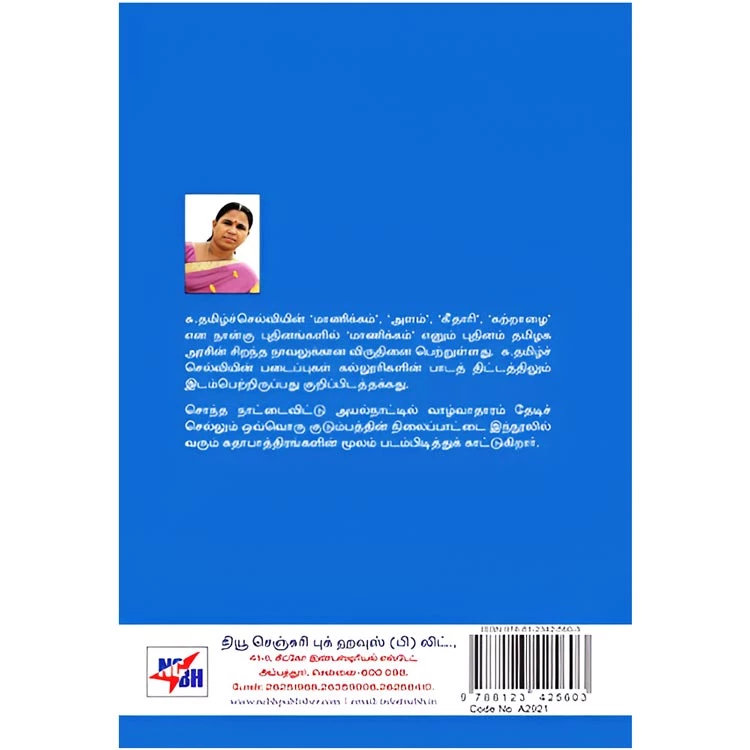 Details : Author : Su. Tamilselvi Category : Novel ISBN : 9788123425603 Weight : 100.00 gm Binding : Paper Back Language : Tamil Publishing Year : 2014 Code no : A2921 அளம் : சு.தமிழ்ச்செல்வியின் ‘மாணிக்கம்’, ‘அளம்’. ‘கீதாரி’, ‘கற்றாழை’ என நான்கு புதினங்களில் ‘மாணிக்கம்” எனும் புதினம் தமிழக அரசின் சிறந்த நாவலுக்கான விருதினை பெற்றுள்ளது. அளம் / Alam சு.தமிழ்ச் செல்வியின் படைப்புகள் கல்லூரிகளின் பாடத் திட்டத்திலும் இடம்பெற்றிருப்பது குறிப்பிடத்தக்கது. சொந்த நாட்டைவிட்டு அயல்நாட்டில் வாழ்வாதாரம் தேடிச் செல்லும் ஒவ்வொரு குடும்பத்தின் நிலைப்பாட்டை இந்நூலில் வரும் கதாபாத்திரங்களின் மூலம் படம்பிடித்துக் காட்டுகிறார். |