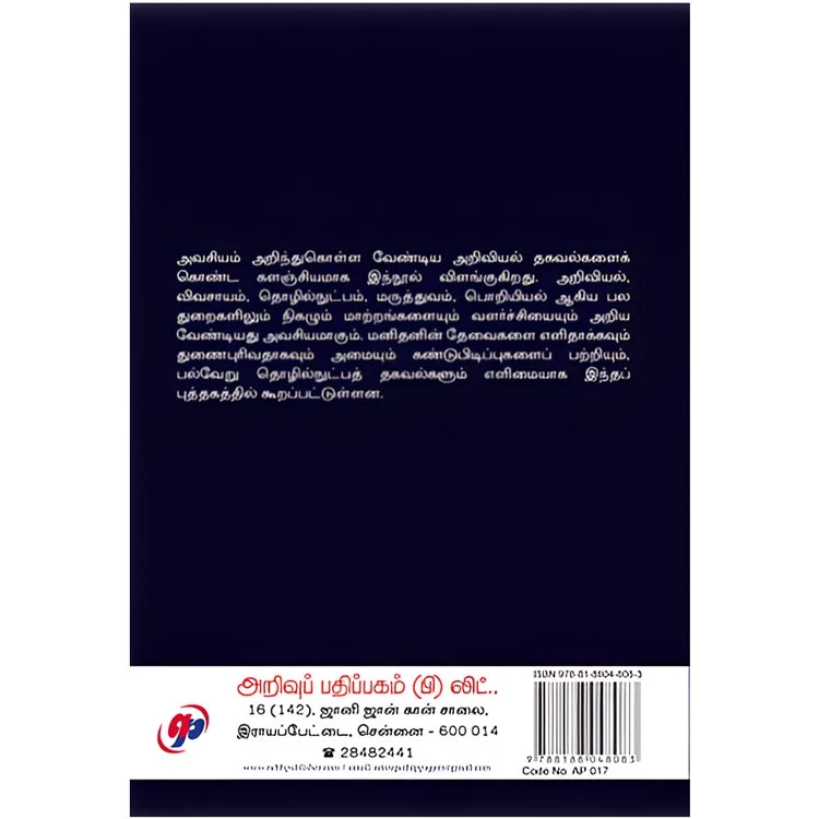 Details : Category : General Knowledge ISBN : 9788188048083 Author : T.R. Namasivayam Weight : 100.00 gm Binding : Paper Back Language : Tamil Publishing Year : 2004 Pages : 106 Code no : AP017 அறிவியல் ஆயிரம் : அவசியம் அறிந்துகொள்ள வேண்டிய அறிவியல் தகவல்களைக் கொண்ட களஞ்சியமாக இந்நூல் விளங்குகிறது. அறிவியல், விவசாயம், தொழில்நுட்பம், மருத்துவம், பொறியியல் ஆகிய பல துறைகளிலும் நிகழும் மாற்றங்களையும் வளர்ச்சியையும் அறிய வேண்டியது அவசியமாகும். மனிதனின் தேவைகளை எளிதாக்கவும் துணைபுரிவதாகவும் அமையும் கண்டுபிடிப்புகளைப் பற்றியும், பல்வேறு தொழில்நுட்பத் தகவல்களும் எளிமையாக இந்தப் புத்தகத்தில் கூறப்பட்டுள்ளன. |