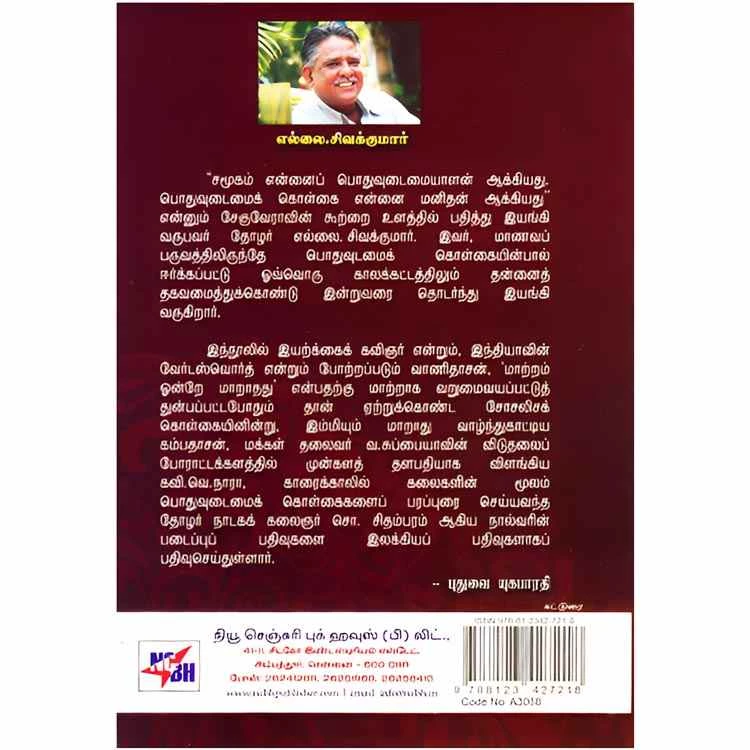 Details : ISBN : 9788123427218 Author : Ellai. Sivakumar Weight : 100.00 gm Binding : Paper Back Language : Tamil Publishing Year : 2014 Pages : 52 Code no : A3068 கவிதைகளும் கவிஞர்களும் : “சமூகம் என்னைப் பொதுவுடைமையாளன் ஆக்கியது. பொதுவுடைமைக் கொள்கை என்னை மனிதன் ஆக்கியது” என்னும் சேகுவேராவின் கூற்றை உளத்தில் பதித்து இயங்கி வருபவர் தோழர் எல்லை. சிவக்குமார். இவர், மாணவப் பருவத்திலிருந்தே பொதுவுடமைக் கொள்கையின்பால் ஈர்க்கப்பட்டு ஓவ்வொரு காலக்கட்டத்திலும் தன்னைத் தகவமைத்துக்கொண்டு இன்றுவரை தொடர்ந்து இயங்கி வருகிறார். இந்நூலில் இயற்க்கைக் கவிஞர் என்றும், இந்தியாவின் வேர்டஸ்வொர்த் என்றும் போற்றப்படும் வாணிதாசன், ‘மாற்றம் ஒன்றே மாறாதது என்பதற்கு மாற்றாக வறுமைவயப்பட்டுத் துன்பப்பட்டபோதும் தான் ஏற்றுக்கொண்ட சோசலிசக் கொள்கையினின்று, இம்மியும் மாறாது வாழ்ந்துகாட்டிய கம்பதாசன், மக்கள் தலைவர் வ.சுப்பையாவின் விடுதலைப் போராட்டக்களத்தில் முன்களத் தளபதியாக விளங்கிய கவி.வெ.நாரா, காரைக்காலில் கலைகளின் மூலம் பொதுவுடைமைக் கொள்கைகளைப் பரப்புரை செய்யவந்த தோழர் நாடகக் கலைஞர் சொ. சிதம்பரம் ஆகிய நால்வரின் படைப்புப் பதிவுகளை இலக்கியப் பதிவுகளாகப் பதிவுசெய்துள்ளார். |