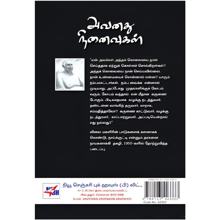 Details : ISBN : 9788123423333 Author : Thakazhi Sivasangarappillai Translator : Yuma Vasuki Weight : 100.00 gm Binding : Paper Back Language : Tamil Publishing Year : Code no : A2697 அவனது நினைவுகள் : “ஏன் அவர்கள் அந்தக் கொலையை நான் செய்ததாக ஏற்றுக் கொள்ளச் சொல்கிறார்கள்? அந்தக் கொலையை நாள் செய்யவில்லை. நான் உண்மையைச் சொன்னால் என்ன? யாரும் நம்பமாட்டார்கள். நம்ப வைக்க என்னால் முடியாது. அப்போது முதலாளிக்குக் கோபம் வரும். கோபம் வந்தால் என் மீதான கருணை போகும். பிடிவாதமாக வழக்கு நடத்துவார். தண்டனை வாங்கித் தருவார், மாறாக, சம்மதித்தாலோ? கருணை காட்டுவார். வழக்கு நடத்துவார். காப்பாற்றுவார். அப்படியென்றால் எது நல்லது?” விலை மகளிரின் பாடுகளைக் களனாகக் கொண்டு, நாய்க்குட்டி என்னும் தரகனை நாயகனாக்கி தகழி, 1950-களில் தோற்றுவித்த படைப்பு. |