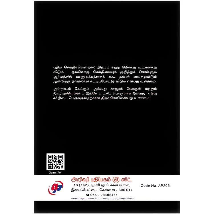 Details : Category : General Knowledge Author : Nagai.M.P. Azhagiyanathan Weight : 100.00 gm Binding : Paper Back Language : Tamil Publishing Year : 2010 Code no : AP268 அவசியம் அறிய வேண்டிய செய்திகள் : செய்திகளென்றால் இதயம் சற்று நிமிர்ந்து உட்கார்ந்து விடும். ஒவ்வொரு செய்தியையும் குறித்துக் கொள்ளும் ஆர்வத்தில் ஊணுறக்கத்தைக் கூட தள்ளி வைத்துவிடும் அளவிற்கு தகவல்கள் கட்டிப்போட்டு விடும் என்பது உண்மை. அன்றாடம் கேட்கும் அல்லது காணும் பொருள் மற்றும் நிகழ்வுகளெல்லாம் இங்கே காட்சிப் பொருளாக நீள்வது அறிவு சக்தியை பெருக்குவதற்கான திறவுகோலென்பது உண்மை. |