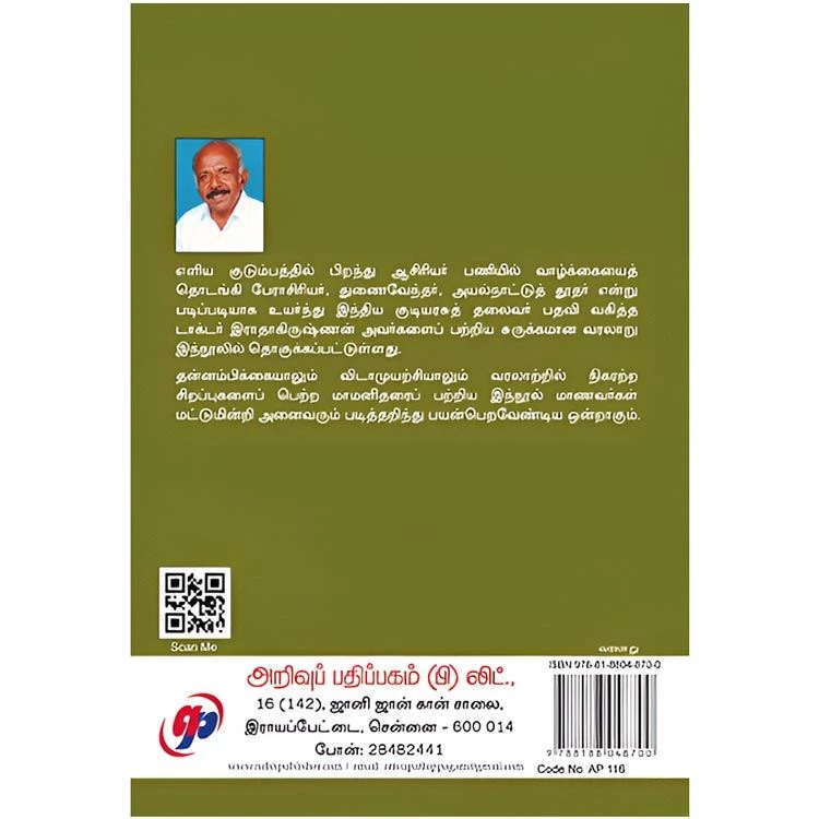 Details : Category : History ISBN : 9788188048700 Author : Kamalavelan Weight : 100.00 gm Binding : Paper Back Language : Tamil Publishing Year : 2008 Code no : AP116 Page: 82 பாரதரத்னா டாக்டர் இராதாகிருஷ்ணன் : எளிய குடும்பத்தில் பிறந்து ஆசிரியர் பணியில் வாழ்க்கையைத் தொடங்கி பேராசிரியர், துணைவேந்தர், அயல்நாட்டுத் தூதர் என்று படிப்படியாக உயர்ந்து இந்திய குடியரசுத் தலைவர் பதவி வகித்த டாக்டர் இராதாகிருஷ்ணன் அவர்களைப் பற்றிய சுருக்கமான வரலாறு இந்நூலில் தொகுக்கப்பட்டுள்ளது. தன்னம்பிக்கையாலும் விடாமுயற்சியாலும் வரலாற்றில் நிகரற்ற சிறப்புகளைப் பெற்ற மாமனிதரைப் பற்றிய இந்நூல் மாணவர்கள் மட்டுமின்றி அனைவரும் படித்தறிந்து பயன்பெறவேண்டிய ஒன்றாகும். |