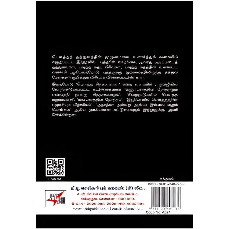 Details : Category : Essay Author : Rahul Sankrityayan ISBN : 9788123407739 Translator : A.G. Ethirajulu Weight : 100.00gm Binding : Paper Back Language : Tamil Publishing Year : 2017 Pages : 240 Code no : A024 பௌத்தத் தத்துவ இயல் : பௌத்தத் தத்துவத்தின் முழுமையை உணர்த் த்தும் வகையில் எழுதப்பட்ட இந்நூலில் புத்தரின் வாழ்க்கை, அவரது அடிப்படைத் தத்துவங்கள், பவுத்த மதப் பிரிவுகள், பவுத்த மதத்தின் உயர்மட்ட வளர்ச்சி ஆகியவற்றோடு புத்தருக்கு முற்காலத்திலிருந்த தத்துவ மேதைகள் குறித்தும் விரிவாக விளக்கப்பட்டுள்ளன. இவற்றோடு ‘பௌத்த சிந்தனைகள்’ என்ற வகையில் ராகுல்ஜியின் தேர்ந்தெடுக்கப்பட்ட கட்டுரைகளான ‘வஜ்ராயனத்தின் தோற்றமும் எண்பத்தி நான்கு சித்தர்கணமும்’, ‘கீழைநாடுகளில் பௌத்த மறுமலர்ச்சி’, ‘மகாயனத்தின் தோற்றம்’, ‘இந்தியாவில் பௌத்தத்தின் எழுச்சியும் வீழ்ச்சியும்’, ‘அநாத்மா அல்லது ஆன்மா இல்லை எனும் கொள்கை’ ஆகிய முக்கியமான கட்டுரைகளும் இந்நூலுக்கு அணி சேர்க்கின்றன. |