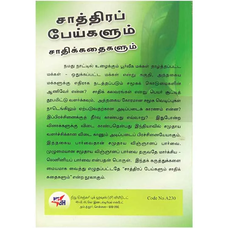 Details : Author : M. V. Sundharam Weight : 100.00 gm Binding : Paper Back Language : Tamil Publishing Year : 1982 Code no : A230 Pages : 230 சாத்திரப் பேய்களும் சாதிக்கதைகளும் : நமது நாட்டில் உழைக்கும் பூர்வீக மக்கள் தாழ்த்தப்பட்ட ஒதுக்கப்பட்ட மக்கள் என்று கருதி, அத்தகைய மக்களுக்கு எதிராக நடத்தப்படும் சமூகக் கொடுமைகளின் ஆணிவேர் என்ன? சாதிக் கலவரங்கள் என்று பெயர் சூட்டித் தூபமிட்டு வளர்க்கவும். அத்தகைய கோரமான சமூக வெடிப்புகள் நாடெங்கிலும் ஏற்படுவதற்கான அடிப்படைக் காரணம் என்ன? இப்பிரச்சினைக்குத் தீர்வு காண்பது எவ்வாறு? இதுபோன்ற வினாக்களுக்கு விடை காண்பதென்பது இந்தியாவில் சமுதாய வளர்ச்சிக்கான விடை காணும் அடிப்படைப் பிரச்சினையேயாகும். இத்தகைய பார்வைதான் சமுதாய விஞ்ஞானப் பார்வை. முழுமையான சமுதாய விஞ்ஞானப் பார்வை தருவதே மார்க்சிய – லெனினியப் பார்வை என்பதன் பொருள். இந்தக் கருத்துக்களை மையமாக வைத்து எழுதப்பட்டதே “சாத்திரப் பேய்களும் சாதிக் கதைகளும்” என்ற நூலாகும். |