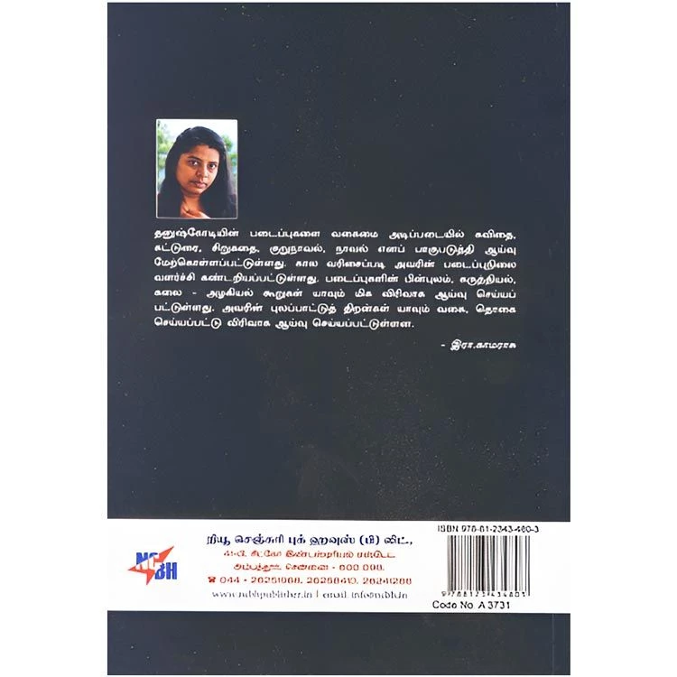 Details : ISBN : 9788123434803 Author : Dr.B. Akila Weight : 150.00 gm Binding : Paper Back Language : Tamil Publishing Year : 2017 Code no : A3731 Pages :292 தனுஷ்கோடி ராம்சாமி : தனுஷ்கோடியின் படைப்புகளை வகைமை அடிப்படையில் கவிதை, கட்டுரை, சிறுகதை, குறுநாவல், நாவல் எனப் பாகுபடுத்தி ஆய்வு மேற்கொள்ளப்பட்டுள்ளது. கால வரிசைப்படி அவரின் படைப்புநிலை வளர்ச்சி கண்டறியப்பட்டுள்ளது. படைப்புகளின் பின்புலம், கருத்தியல், சுலை – அழகியல் கூறுகள் யாவும் மிக விரிவாக ஆய்வு செய்யப் பட்டுள்ளது. அவரின் புலப்பாட்டுத் திறன்கள் யாவும் வகை, தொகை செய்யப்பட்டு விரிவாக ஆய்வு செய்யப்பட்டுள்ளன. இரா.காமராசு |