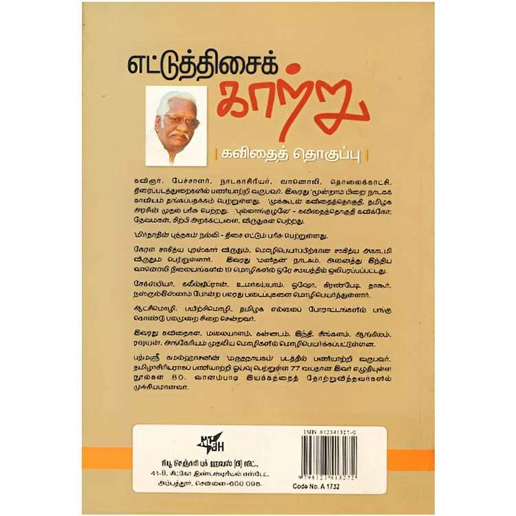 Details : ISBN : 8123413270 Author : Puviyarasu Weight : 100.00 gm Binding : Paper Back Language : Tamil Publishing Year : 2008 Code no : A1732 Pages : 172 எட்டுத்திசைக் காற்று : (கவிதைத் தொகுப்பு) கவிஞர். பேச்சாளர், நாடகாசிரியர், வானொலி, தொலைக்காட்சி. திரைப்படத்துறைகளில் பணியாற்றி வருபவர். இவரது ‘மூன்றாம் பிறை’ நாடகக் காவியம் தங்கப்பதக்கம் பெற்றுள்ளது. முக்கூடன் கவிதைத்தொகுதி. தமிழக அரசின் முதல் பரிசு பெற்றது. புல்லாங்குழலே’ – கவிதைத்தொகுதி கவிக்கோ; தேவமகள், சிற்பி அறக்கட்டளை. விருதுகள் பெற்றது. ‘மிர்தாதின் புத்தகம்’ நல்வி – திசை எட்டும் பரிசு பெற்றுள்ளது. கேரள சாகித்ய புரஸ்கார் விருதும், மொழிபெயர்ப்பிற்கான சாகித்ய அகாடமி விருதும் பெற்றுள்ளார். இவரது “மனிதன் நாடகம், அனைத்து இந்திய வானொலி நிலையங்களில் 19 மொழிகளில் ஒரே சமயத்தில் ஒலிபரப்பப்பட்டது. சேக்ஸ்பியர். கலீல்ஜிப்ரான். உமர்கய்யாம். ஓஷோ, கிரண்பேடி தாகூர். நஸ்ருல் இஸ்லாம் போன்ற பலரது படைப்புகளை மொழிபெயர்த்துள்ளார். ஆட்சிமொழி. பயிற்சிமொழி, தமிழக எல்லைப் போராட்டங்களில் பங்கு கொண்டு பலமுறை சிறை சென்றவர். இவரது கவிதைகள், மலையாளம், கன்னடம், இந்தி, சிங்களம், ஆங்கிலம், ரஷ்யன், அங்கேரியம் முதலிய மொழிகளில் மொழிபெயர்க்கப்பட்டுள்ளன. பத்மஸ்ரீ கமல்ஹாசனின் ‘மருதநாயகம் படத்தில் பணியாற்றி வருபவர். தமிழாசிரியராகப் பணியாற்றி ஓய்வு பெற்றுள்ள 77 வயதான இவர் எழுதியுள்ள நூல்கள் 80. வானம்பாடி இயக்கத்தைத் தோற்றுவித்தவர்களில் முக்கியமானவர். |