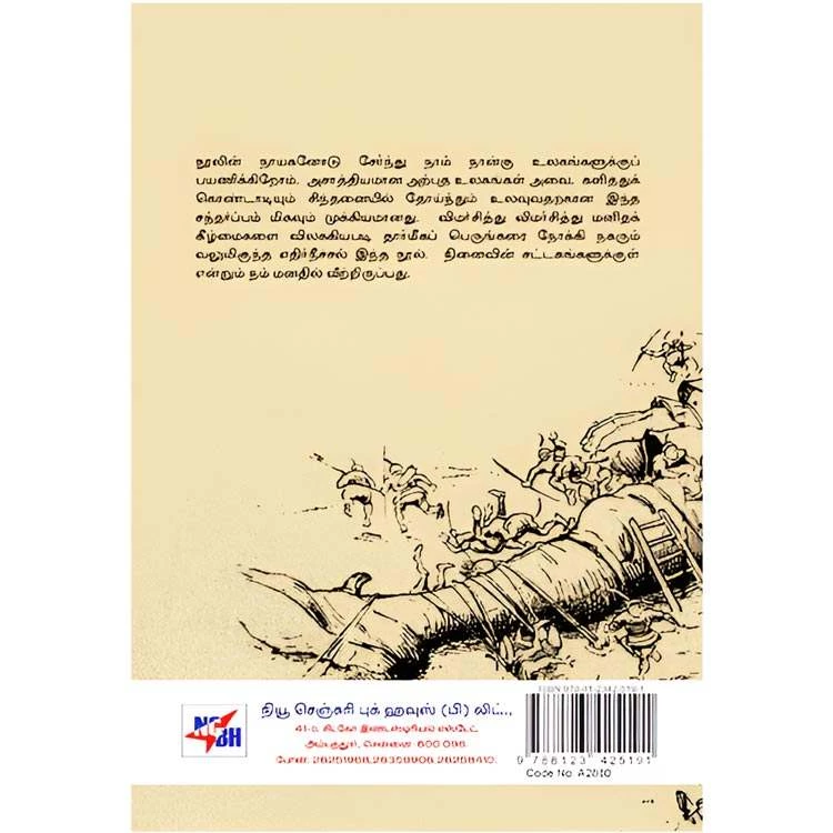 Details : Book Title : கலிவரின் பயணங்கள் Edition : 2 ISBN : 9788123425191 Author : Jonadhan Svipt Translator : Yuma Vasuki Weight : 100.00 gm Binding : Paper Back Language : Tamil Pages : 301 Publishing Year : 2013 Code no : A2880 கலிவரின் பயணங்கள் : நூலின் நாயகனோடு சேர்ந்து நாம் நான்கு உலகங்களுக்குப் பயணிக்கிறோம். அசாத்தியமான அற்புத உலகங்கள் அவை. களித்துக் கொண்டாடியும் சிந்தனையில் தோய்ந்தும் உலவுவதற்கான இந்த சந்தர்ப்பம் மிகவும் முக்கியமானது. விமர்சித்து விமர்சித்து மனிதக் கீழ்மைகளை விலக்கியபடி தார்மீகப் பெருங்கரை நோக்கி நகரும் வலுமிகுந்த எதிர்நீச்சல் இந்த நூல், நினைவின் சட்டகங்களுக்குள் என்றும் நம் மனதில் வீற்றிருப்பது. |