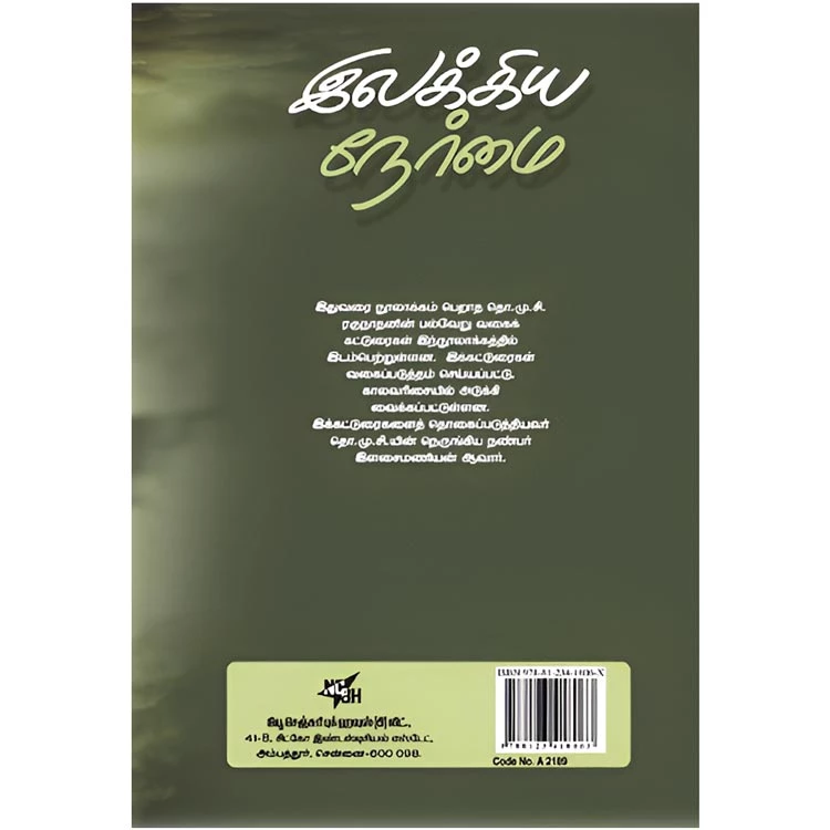 Details : Category : Literature , Articles ISBN : 978812341806-X Author : Ilasaimanian Weight : 100.00 gm Binding : Paper Back Language : Tamil Publishing Year : 2010 Code no : A2189 Pages : 342 இலக்கிய நேர்மை : இதுவரை நூலாக்கம் பெறாத தொ.மு.சி. ரகுநாதனின் பல்வேறு வகைக் கட்டுரைகள் இந்நூலாக்கத்தில் இடம்பெற்றுள்ளன. இக்கட்டுரைகள் வகைப்படுத்தம் செய்யப்பட்டு, காலவரிசையில் அடுக்கி வைக்கப்பட்டுள்ளன. இக்கட்டுரைகளைத் தொகைப்படுத்தியவர் தொ.மு.சி.யின் நெருங்கிய நண்பர் இளசைமணியன் ஆவார். |
