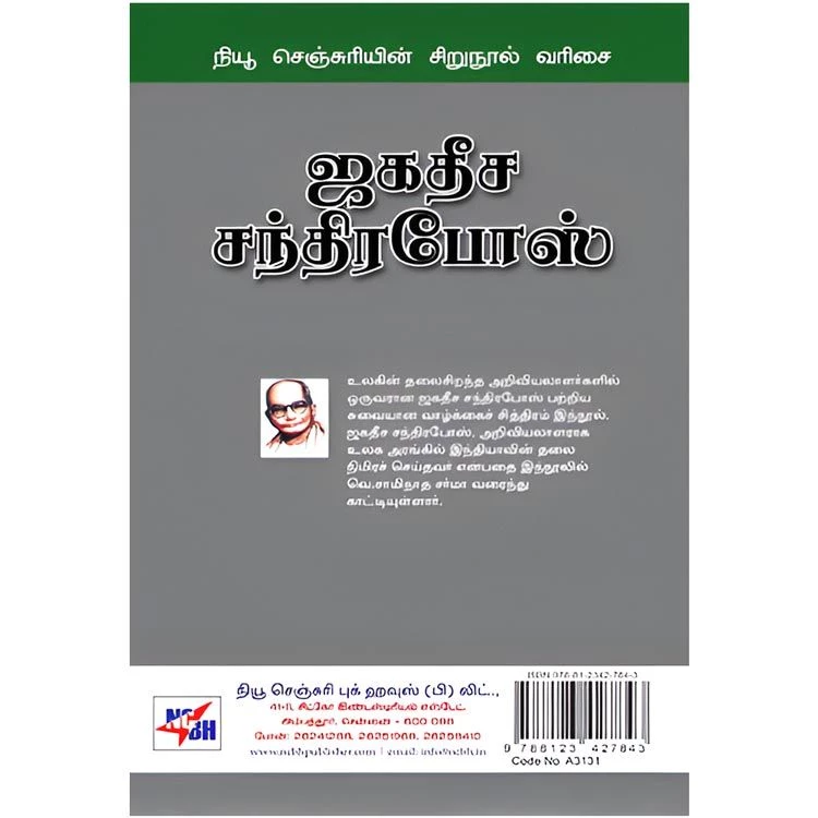 Details : Category : Sirunool Varisai ISBN : 9788123427843 Author : Swaminatha Sarma Weight : 100.00 gm Binding : Paper Back Language : Tamil Code no : A3131 ஜகதீச சந்திரபோஸ் : உலகின் தலைசிறந்த அறிவியலாளர்களில் ஒருவரான ஜகதீச சந்திரபோஸ் பற்றிய சுவையான வாழ்க்கைச் சித்திரம் இந்நூல். ஜகதீச சந்திரபோஸ், அறிவியலாளராக உலக அரங்கில் இந்தியாவின் தலை நிமிரச் செய்தவர் என்பதை இந்நூலில் வெ.சாமிநாத சர்மா வரைந்து காட்டியுள்ளார். |