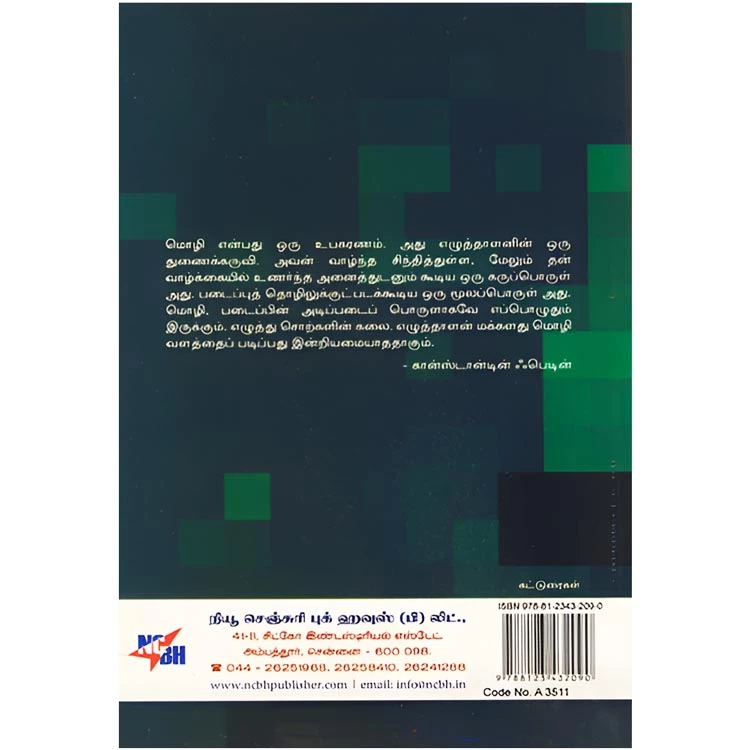 Details : ISBN : 9788123432090 Author : T.S. Natarasan Weight : 100.00 gm Binding : Paper Back Language : Tamil Publishing Year : 1978 Code no : A3511 Pages : 94 கலையும் மொழியும் : மொழி என்பது ஒரு உபகரணம். அது எழுத்தாளனின் ஒரு துணைக்கருவி, அவன் வாழ்ந்த சிந்தித்துள்ள, மேலும் தன் வாழ்க்கையில் உணர்ந்த அனைத்துடனும் கூடிய ஒரு கருப்பொருள் அது. படைப்புத் தொழிலுக்குட்படக்கூடிய ஒரு மூலப்பொருள் அது. மொழி, படைப்பின் அடிப்படைப் பொருளாகவே எப்பொழுதும் இருக்கும். எழுத்து சொற்களின் கலை. எழுத்தாளன் மக்களது மொழி வளத்தைப் படிப்பது இன்றியமையாததாகும். -கான்ஸ்டான்டின் ஃபெடின் |