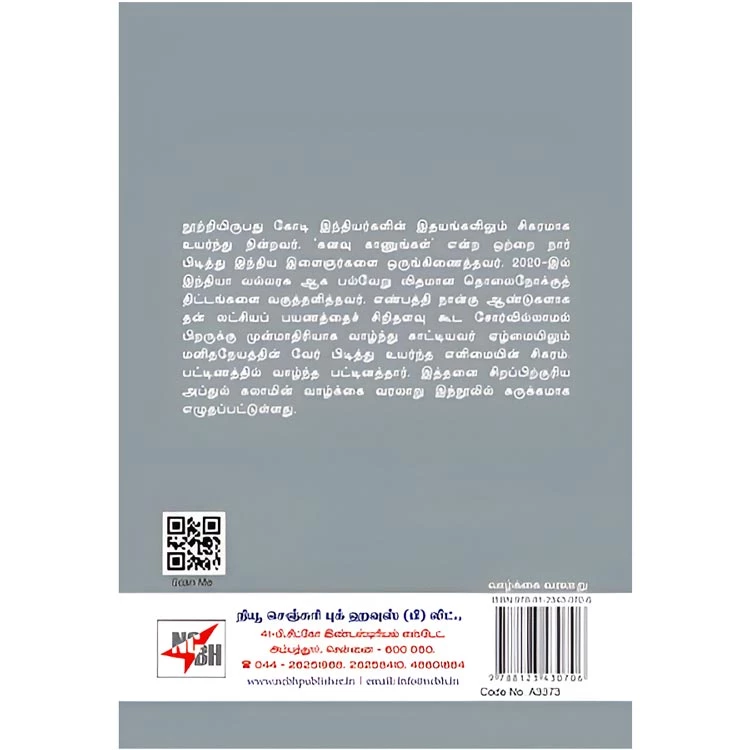 Details : Category : History ISBN : 9788123430706 Author : Prof. Ibrahim Weight : 100.00gm Binding : paper back Language : Tamil Publishing Year : 2011 Code no : A3373 காலமெல்லாம் கலாம் : நூற்றியிருபது கோடி இந்தியர்களின் இதயங்களிலும் சிகரமாக உயர்ந்து நின்றவர். ‘கனவு காணுங்கள்’ என்ற ஒற்றை நார் பிடித்து இந்திய இளைஞர்களை ஒருங்கிணைத்தவர். 2020-இல் இந்தியா வல்லரசு ஆக பல்வேறு விதமான தொலைநோக்குத் திட்டங்களை வகுத்தளித்தவர். எண்பத்தி நான்கு ஆண்டுகளாக தன் லட்சியப் பயணத்தைச் சிறிதளவு கூட சோர்வில்லாமல் பிறருக்கு முன்மாதிரியாக வாழ்ந்து காட்டியவர். ஏழ்மையிலும் மனிதநேயத்தின் வேர் பிடித்து உயர்ந்த எளிமையின் சிகரம். பட்டிணத்தில் வாழ்ந்த பட்டினத்தார். இத்தனை சிறப்பிற்குரிய அப்துல் கலாமின் வாழ்க்கை வரலாறு இந்நூலில் சுருக்கமாக எழுதப்பட்டுள்ளது. |