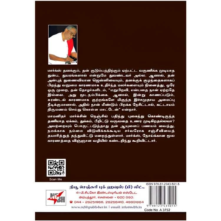 Details : ISBN : 9788123435015 Author : D. Pandian Weight : 100.00 gm Binding : Paper Back Language : Tamil Pages : 140 Publishing Year : 2017 Code no : A3752 கார்ல் மார்க்ஸ் வாழ்வும் பணியும் : மார்க்ஸ் தனக்கும், தன் குடும்பத்திற்கும் ஏற்பட்ட வருணிக்க முடியாத துன்ப, துயரங்களால் என்றுமே துவண்டவர் அல்ல. ஆனால், தன் அன்புத் துணைவியான ஜென்னியையும், தனக்குக் குழந்தைகளாகப் பிறந்து வறுமை காரணமாக உதிர்ந்த மலர்களையும் நினைத்து, ஒரே ஒரு முறை, தன் தோழர்களிடம், “மறுபிறவி, என்பதை நான் ஏற்றதே இல்லை. அது மூடநம்பிக்கை. ஆனால், இன்று காணப்படும், சுரண்டல் காரணமாக குற்றங்களே மிகுந்த இச்சமுதாய அமைப்பு நீடிக்குமானால், அதில் நான் மீண்டும் பிறக்க நேரிட்டால், கட்டாயம் திருமணம் செய்து கொள்ள மாட்டேன்” என்றார். மாமனிதர் மார்க்சின் நெஞ்சில் பதிந்து புகைந்து கொண்டிருந்த தணியாத ஏக்கம், துக்கம், பீறிட்டு வருவதை உணர முடிகிறதல்லவா? அவற்றையும் பொருட்படுத்தாது தன் ஆயுளைப் பணயம் வைத்து, நமக்காக நம்மை விடுவிக்கக்கூடிய சர்வரோக சஞ்சீவியைத் தயாரித்துத் தந்துவிட்டு மறைந்துள்ளார். மார்க்ஸ், நோய்க்கான மூல காரணத்தை விஞ்ஞான வழியில் கண்டறிந்து கூறிவிட்டார். |
