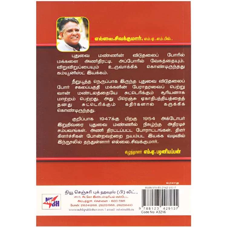 Details : ISBN : 9788123429137 Author : Ellai.Sivakumar Weight : 100.00 gm Binding : Paper Back Language : Tamil Publishing Year : 2015 Code no : A3216 Pages : 84 கொரில்லாப் போர் : புதுவை மண்ணின் விடுதலைப் போரில் மக்களை அணிதிரட்டி. அப்போரில் வேகத்தையும். விறுவிறுப்பையும் உருவாக்கிக் கொண்டிருந்தது கம்யூனிஸ்ட் இயக்கம். நீறுபூத்த நெருப்பாக இருந்த புதுவை விடுதலைப் போர் சகலப்பகுதி மக்களின் பேராதரவைப் பெற்று வான் மண்டலத்தையே சுட்டெரிக்கும் சூரியனாக மாற்றம் பெற்றது. அது பிரெஞ்சு ஏகாதிபத்தியத்தைத் தனது சுட்டெரிக்கும் கதிர்களால் கருக்கிக் கொண்டிருந்தது. குறிப்பாக 1947க்கு பிறகு 1954 அக்டோபர் இறுதிவரை புதுவை மண்ணில் நிகழ்ந்த அதிரடிச் சம்பவங்கள், அணி திரட்டப்பட்ட போராட்டங்கள். திடீர் கிளர்ச்சிகள் போன்றவற்றை நயம்பட இயக்க வடிவில் இந்நூலில் தந்துள்ளார் எல்லை.சிவக்குமார். எழுத்தாளர் எம்.ஏ.பழனியப்பன் |