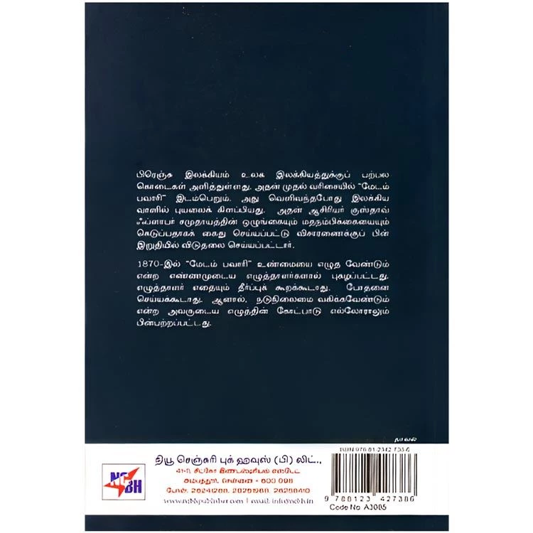 Details : ISBN : 9788123427386 Author : Kushthaw Flaffar Translator : KO. Parameshwaran Weight : 100.00 gm Binding : Paper Back Language : Tamil Publishing Year : 2014 Pages : 122 Code no : A3085 மேடம் பவாரி / Madam Pavari : பிரெஞ்சு இலக்கியம் உலக இலக்கியத்துக்குப் பற்பல கொடைகள் அளித்துள்ளது. அதன் முதல் வரிசையில் “மேடம் பவாரி” இடம்பெறும். அது வெளிவந்தபோது இலக்கியவானில் புயலைக் கிளப்பியது, அதன் ஆசிரியர் குஸ்தாவ் ஃப்ளாபர் சமுதாயத்தின் ஒழுங்கையும் மதநம்பிக்கையையும் கெடுப்பதாகக் கைது செய்யப்பட்டு விசாரணைக்குப் பின் இறுதியில் விடுதலை செய்யப்பட்டார். 1870-இல் “மேடம் பவாரி” உண்மையை எழுத வேண்டும் என்ற எண்ணமுடைய எழுத்தாளர்களால் புகழப்பட்டது. எழுத்தாளர் எதையும் தீர்ப்புக் கூறக்கூடாது. போதனை செய்யக்கூடாது. ஆனால், நடுநிலைமை வகிக்கவேண்டும் என்ற அவருடைய எழுத்தின் கோட்பாடு எல்லோராலும் பின்பற்றப்பட்டது. பவாரி |