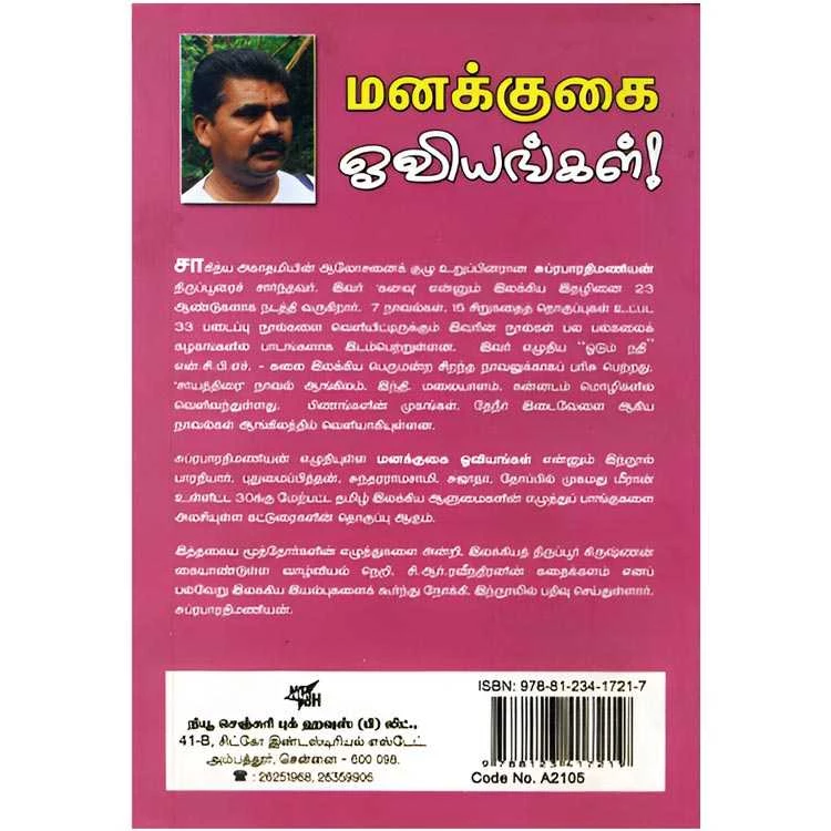 Details : ISBN : 9788123417219 Author : Subrabharathimanian Weight : 100.00 gm Binding : Paper Back Language : Tamil Publishing Year : 2010 Code no : A2105 Pages : 112 மனக்குகை ஓவியங்கள் : சாகித்ய அகாதமியின் ஆலோசனைக் குழு உறுப்பினரான சுப்ரபாரதிமணியன் திருப்பூரைச் சார்ந்தவர். இவர் ‘கனவு’ என்னும் இலக்கிய இதழினை 23 ஆண்டுகளாக நடத்தி வருகிறார். 7 நாவல்கள், 15 சிறுகதைத் தொகுப்புகள் உட்பட 33 படைப்பு நூல்களை வெளியிட்டிருக்கும் இவரின் நூல்கள் பல பல்கலைக்கழகங்களில் பாடங்களாக இடம்பெற்றுள்ளன. இவர் எழுதிய “ஓடும் நதி என்.சி.பி.எச். – கலை இலக்கிய பெருமன்ற சிறந்த நாவலுக்காகப் பரிசு பெற்றது. “சாயத்திரை” நாவல் ஆங்கிலம், இந்தி, மலையாளம். கன்னடம் மொழிகளில் வெளிவந்துள்ளது. பிணங்களின் முகங்கள். தேநீர் இடைவேளை ஆகிய நாவல்கள் ஆங்கிலத்தில் வெளியாகியுள்ளன. சுப்ரபாரதிமணியன் எழுதியுள்ள மனக்குகை ஓவியங்கள் என்னும் இந்நூல் பாரதியார். புதுமைப்பித்தன். சுந்தரராமசாமி, சுஜாதா. தோப்பில் முகமது மீரான் உள்ளிட்ட 30க்கு மேற்பட்ட தமிழ் இலக்கிய ஆளுமைகளின் எழுத்துப் பாங்குகளை அலசியுள்ள கட்டுரைகளின் தொகுப்பு ஆகும். இத்தகைய மூத்தோர்களின் எழுத்துகளை அன்றி, இலக்கியத் திருப்பூர் கிருஷ்ணன் கையாண்டுள்ள வாழ்வியல் நெறி, சி.ஆர்.ரவீந்திரனின் கதைக்களம் எனப் பல்வேறு இலக்கிய இயல்புகளைக் கூர்ந்து நோக்கி. இந்நூலில் பதிவு செய்துள்ளார். சுப்ரபாரதிமணியன். |